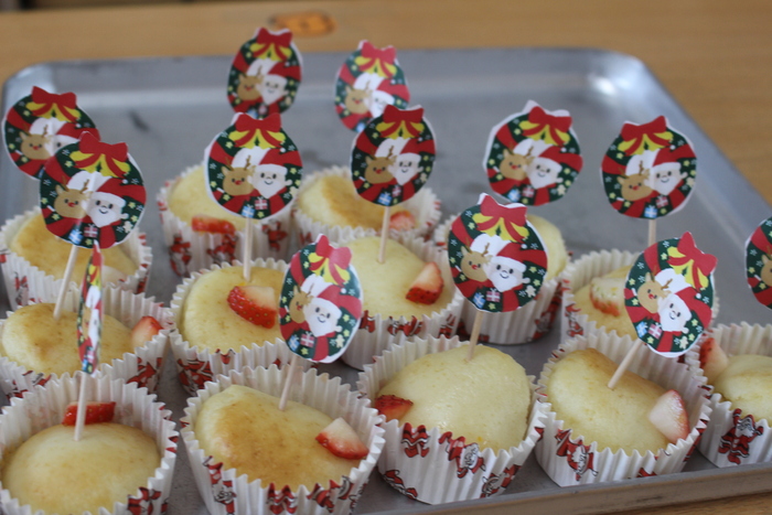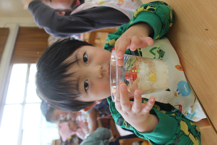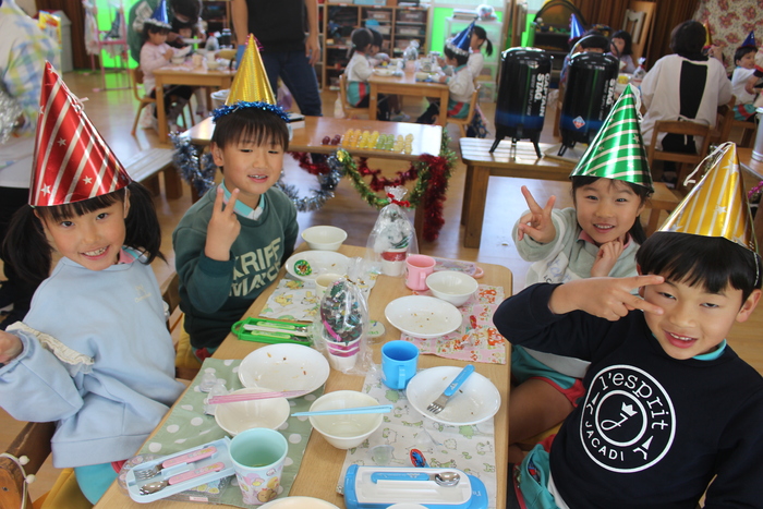 年長・年中・年少クラスが集まって給食はパーティーです! おかわりもたくさんしました。 おやつの、カップケーキも美味しかったね。 | ||
