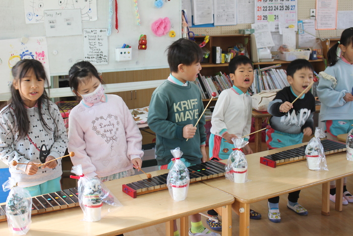 1月5日(月) 明けましておめでとうございます 今年もよろしくお願いいたします 始園式 冬休みも終わり、子どもたちの元気な声が園庭に響いています。 始園式では年長さんが頑張りたいことを発表してくれました。 「小学生になったら、みんなと仲良くしたいです」 「野菜を食べて大きくなりたいです」 「お兄ちゃんみたいに頑張って努力したいです」 | ||