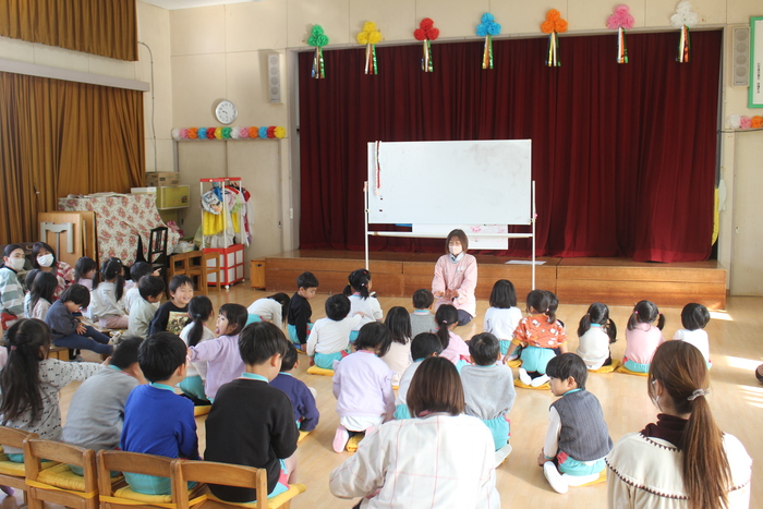 始園式ではゆり先生からお話がありました。 「保育園では楽しい遊びや、行事がいっぱいあります」 「はやね・早起き、朝ご飯をしっかり食べて、元気に保育園に来てね」 「美味し給食も、モリモリ食べようね」 | ||