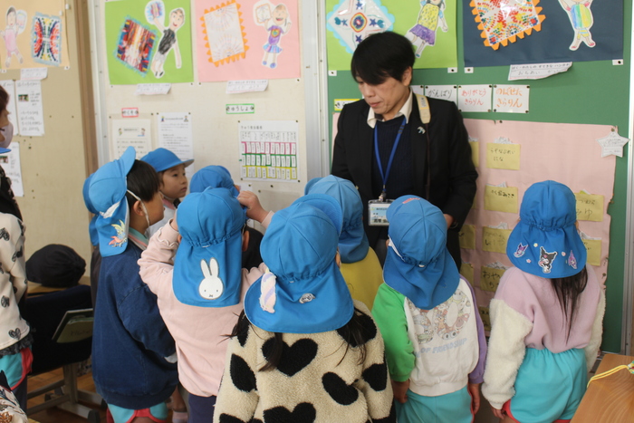 1月15日(木) 河城小学校交流② 年長児が河城小学校に行ってきました。 今日は校舎内を、校長先生と教頭先生が案内してくれました。 | ||