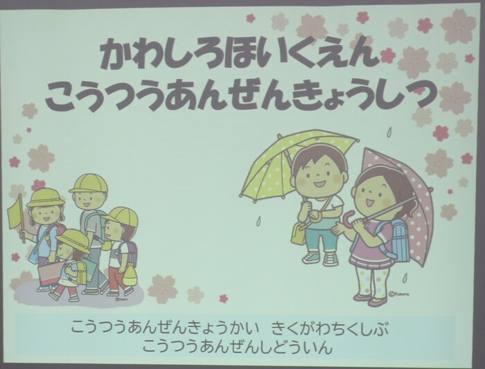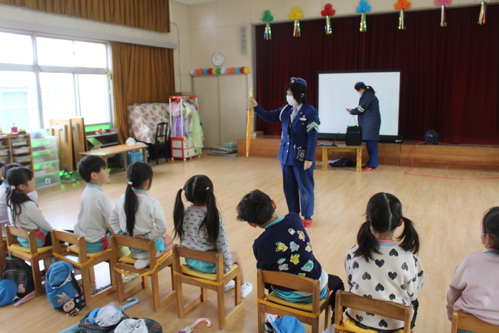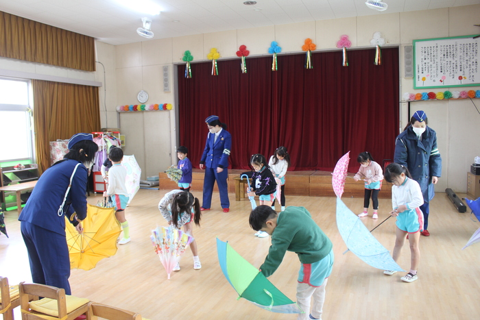 1月19日(月) 交通安全教室(年長) 小学校就学に向けての交通安全教室が行われました。 交通ルールと、傘の差し方を教えていただきました。 | ||
