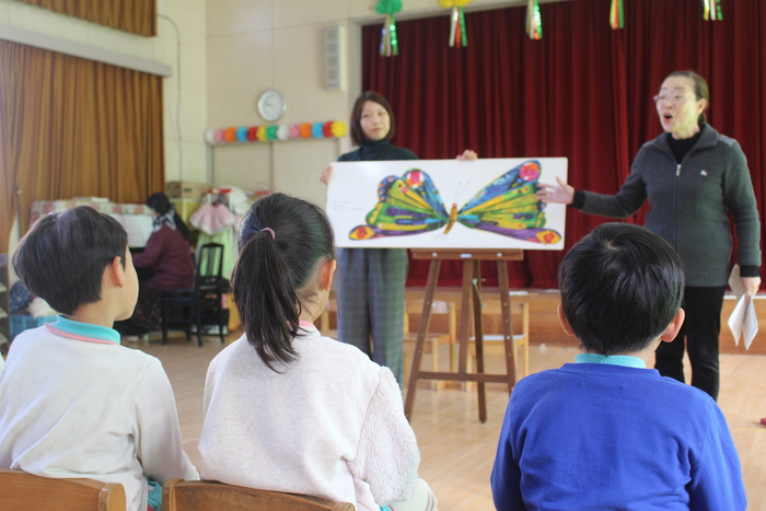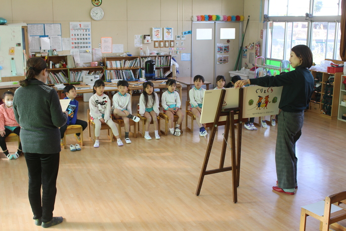 絵本の読み聞かせ(年長) 市の方が来てくださり、読み聞かせをしてくださいましました。 『いろいろかぞく』『なんのくるまにのるのかな』『ぐりとるら』『はらぺこあおむし』 ”さんぽ”の歌を歌ったり、絵本を見たりととても楽しい時間でした。 | ||