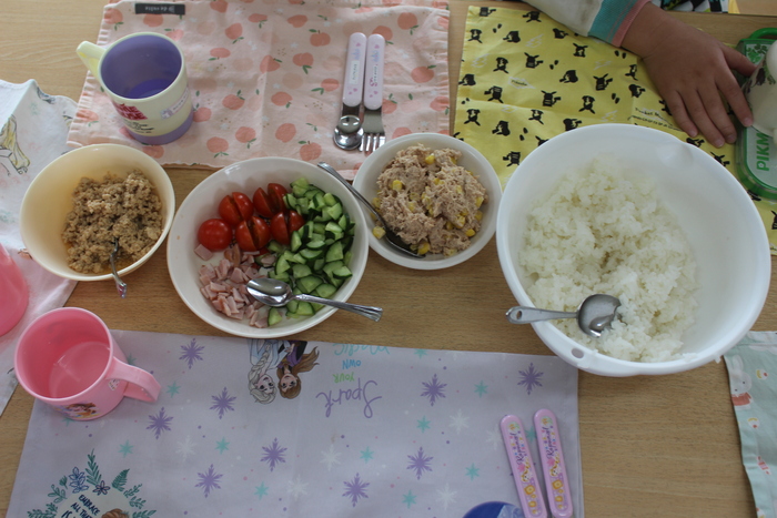 5月21日(水) おにぎりクッキング&青空ランチ 今日はみんなで、お家から持ってきたごはんでおにぎりを作りました。 ツナマヨ、わかめなどみんな好きな具材を選んで、上手に作ることができました。 お給食の時間、テラスにテーブルを並べてみんなで青空ランチ。 楽しみにしていた手作りのおにぎりをみんなでワイワイお話しながら食べました。 とっても楽しかったね♪ | ||