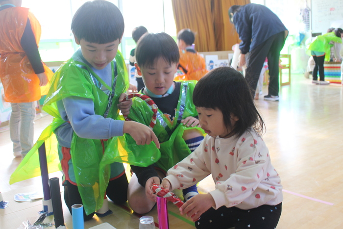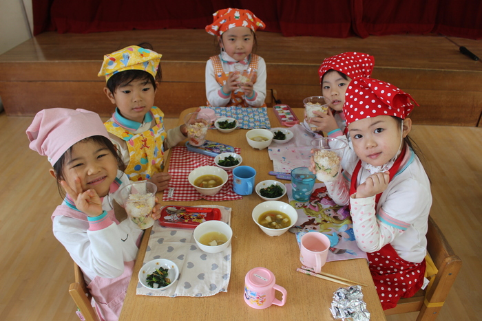 1月20日(火) なかよしクッキング 年長・年中・年少クラスが集まり、カップ寿司を作りました。 カップに酢飯をいれて、具材和好きな順番で。それぞれ個性が出てとても楽しかったです。 味もちょうどよく、「おいし!」「めっちゃうまい!」パクパクあっという間にたべてしまいました。 | ||