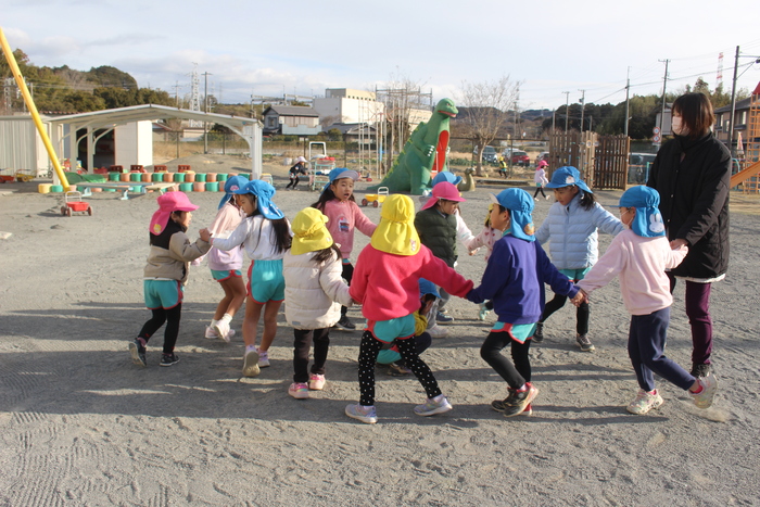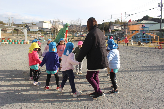 1月21日(水) ♪かーごめ かごめ かーごのなーかのとーりーは~♪ 最初は4人でやっていたら、 「なかまに いーれーて!」 と人数が増えていきました ♪うしろのしょーめん だーぁれ♪ 異年齢で楽しく伝承遊びです | ||