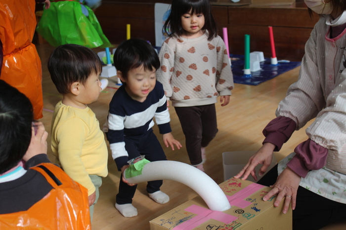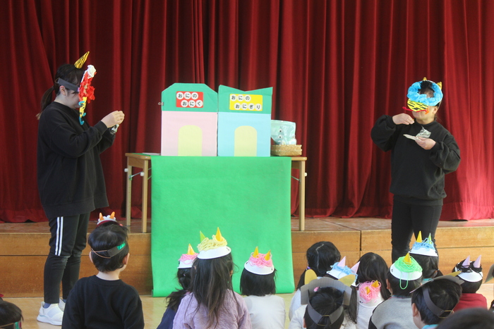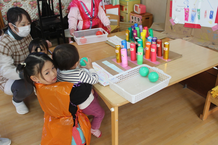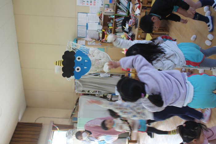 『おにのおにぎりやさんとおにのおにくやさん』のお話を聞いたり、玉入れをして遊びました。 | ||