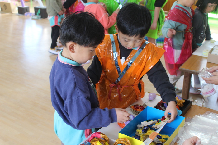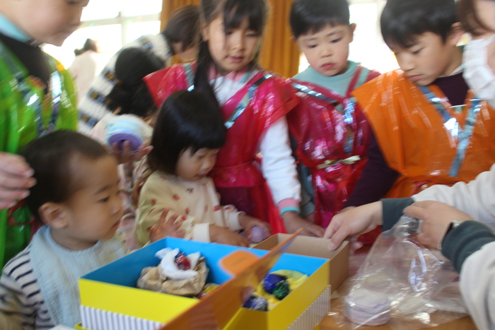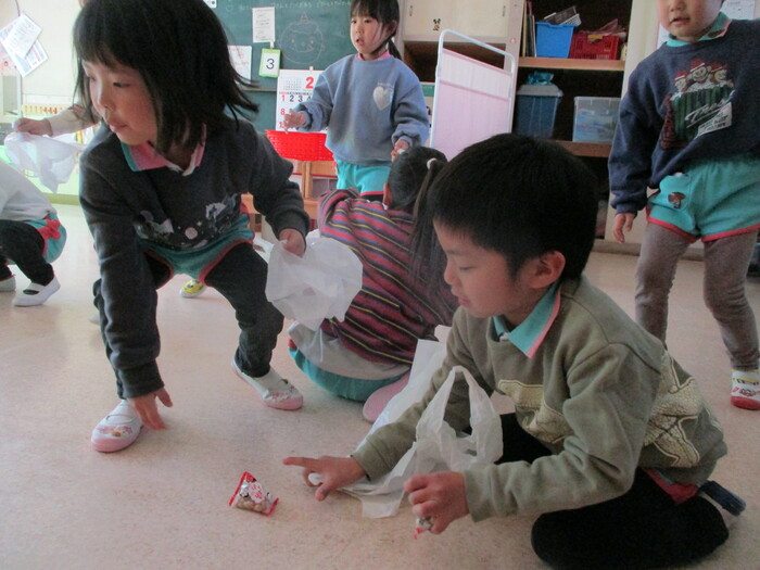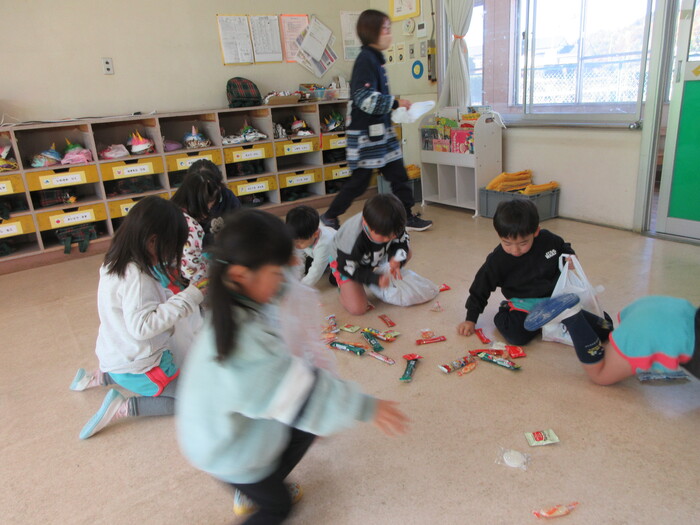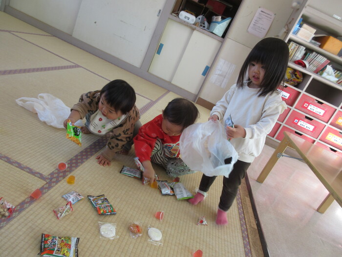 クラスに分かれてお菓子まき。 袋いっぱいにお菓子を拾いました。 | ||