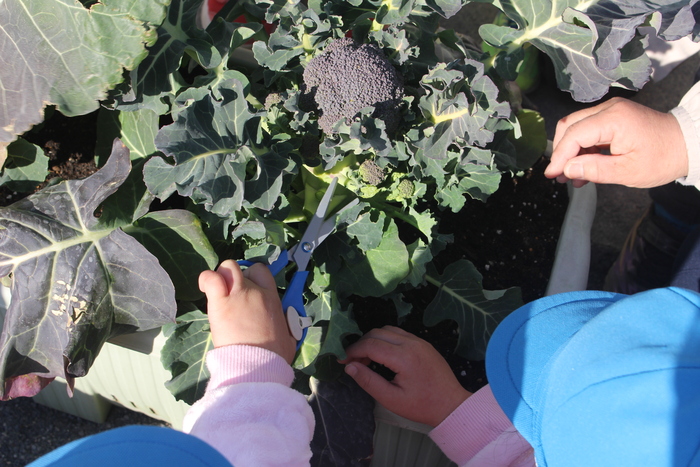 2月6日(金) ブロッコリーの収穫 プランターで育てたブロッコリー、そろそろ収穫時です。 順番に、ハサミでちょきんと切っていきました。 | ||