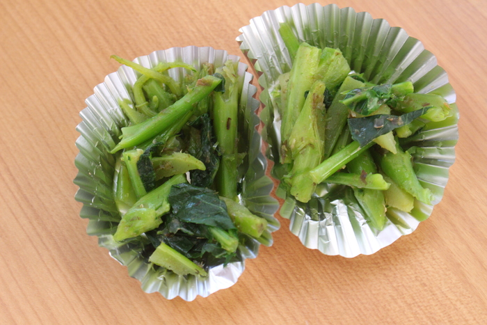 ブロッコリー、葉っぱ、茎 それぞれ茹でて、余すところなく美味しく頂きました。 | ||