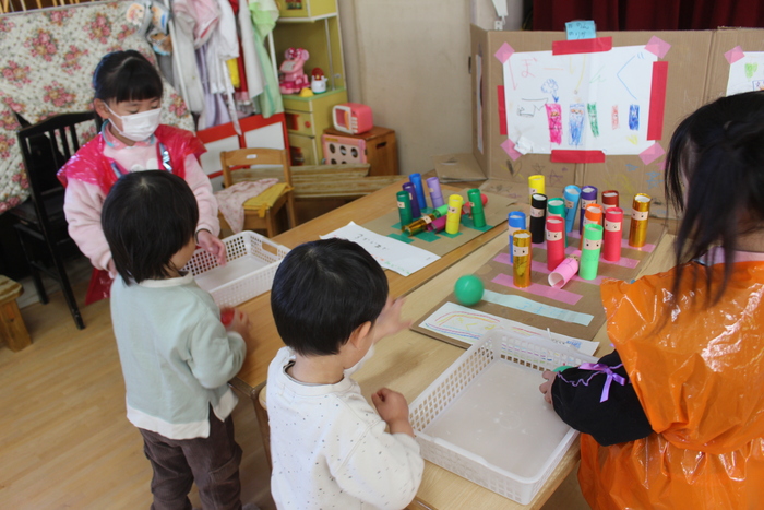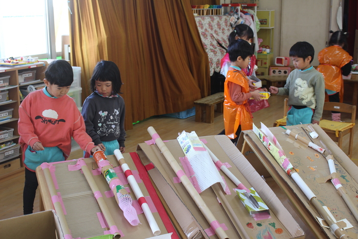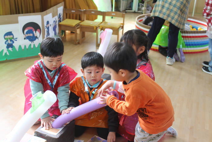 2月10日(火) ゲームランド 年長児さんが考えて作ったゲームがいっぱい! 『にんじゃしゅりけんゲームランド』の開店です。 | ||