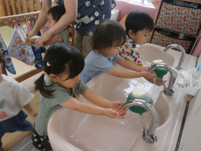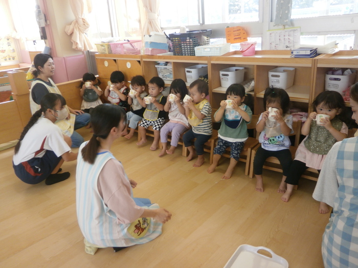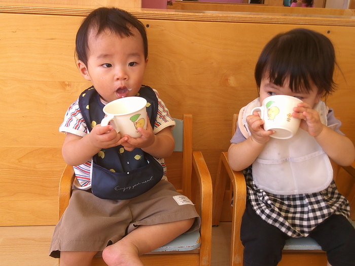 今月から手洗いを始めました。石鹸をつけてゴシゴシ。洗った後は自分のタオルでふきます。手洗いも、『自分のタオル』も嬉しくて、なかなか終わらない手洗い(笑)おかげでピッカピカです✨ りす組さんの午前おやつ。 この日は、中学生が職場体験に来ており、お手伝いしてくれました。 ちゃんと椅子に座って、しっかりコップを持って。 お兄さんお姉さんになりました😀 | ||
