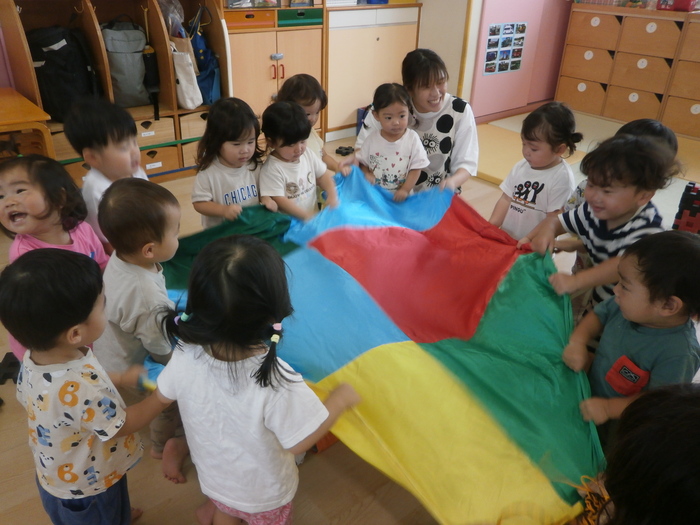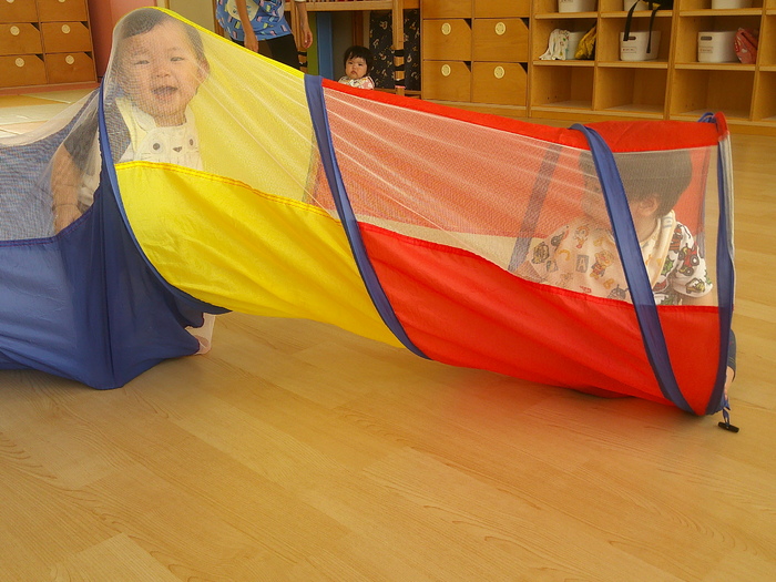 「牛乳おいしい~♡」 午前のおやつの時間です。 自分でコップを持ってこぼさずに飲めるようになりました。 「こんなこともできちゃうよー😁」 大好きなトンネル遊び。 いろいろな動きができるようになり、楽しさアップです😊 | ||