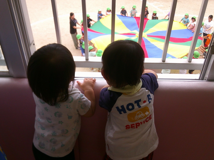 お部屋の窓から応援中☺ 「ぞう組さんがんばれー‼」 ぞう組さんのバルーン演技をマネっこしてみました😁 なかなか上手でしょ♡ | ||