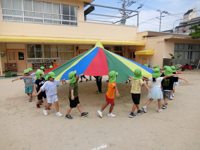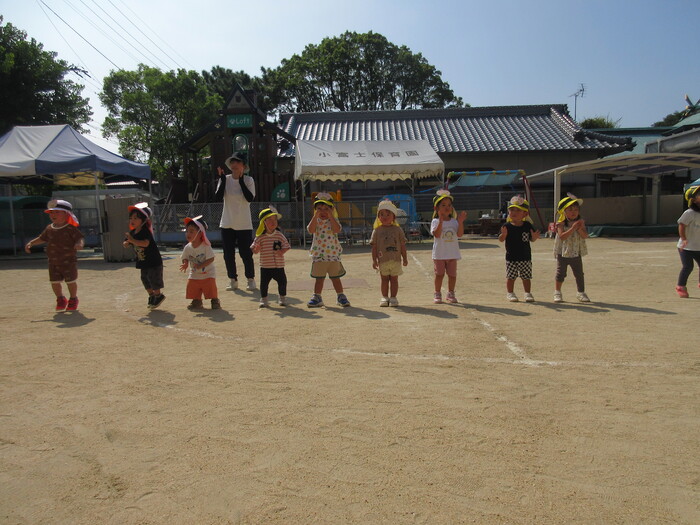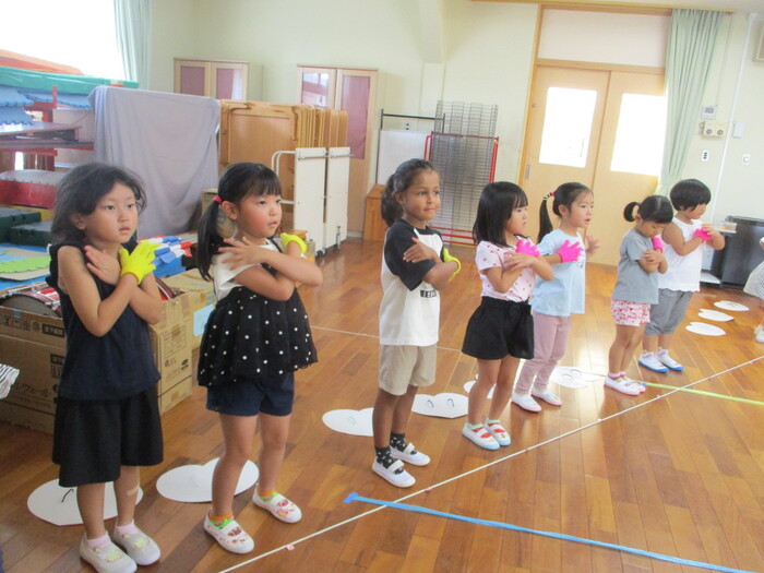 ダンスの練習中🎵 まずは、ホールで振りや動きを覚えて、園庭へ。 みんなの動きもそろってきました。 運動会まであと少し。 頑張るぞ✨ | ||