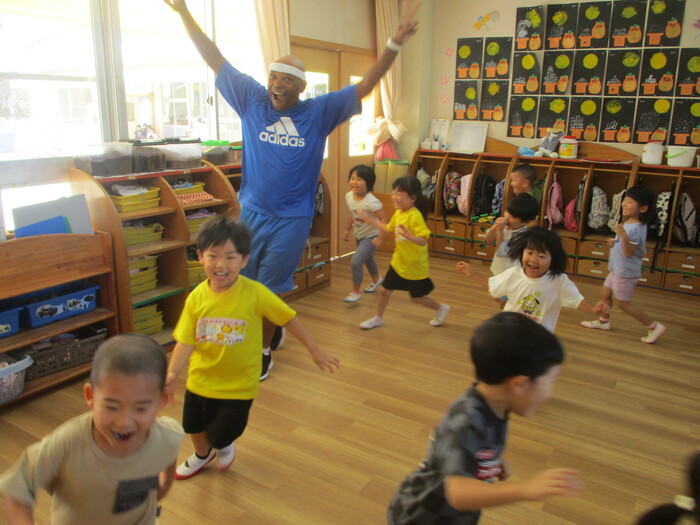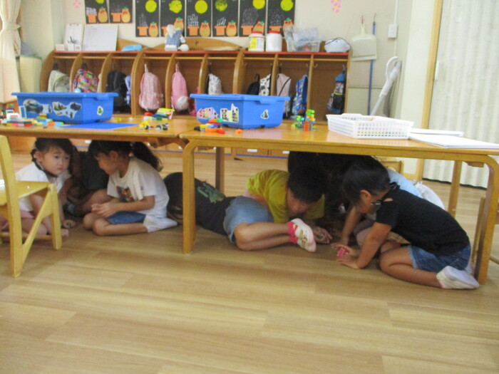 答えは、避難訓練。 『地震=机の下』が身について、みんな上手に避難できました。 英語の時間は、運動会練習の合間の楽しいひととき♡ ケビン先生もとっても楽しそうです🤗 | ||