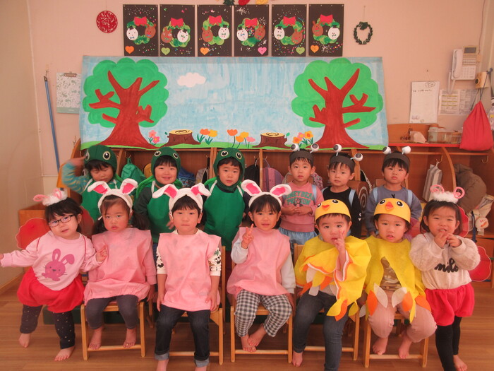 「あなたはだーれ?」 「はやあしうさぎです」 くいしんぼうねずみ・おしゃれきつね・はいいろおおかみ・のっそりくま・・・ ちょっと難しい名前の動物たちですが、 ちゃんと自分の役をおぼえてやりとりをしていました🙂 | ||