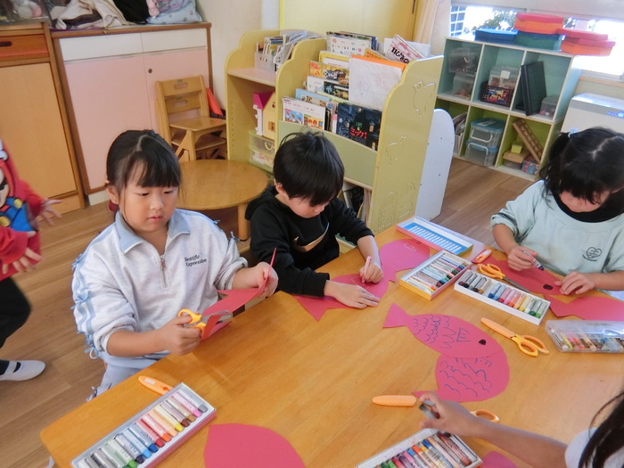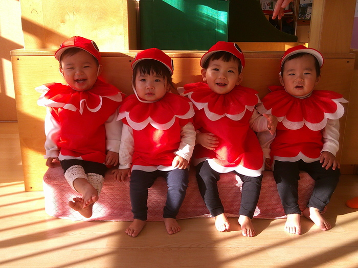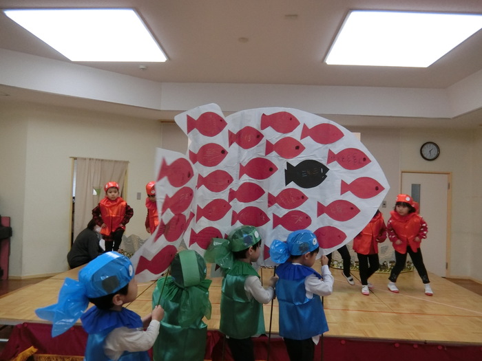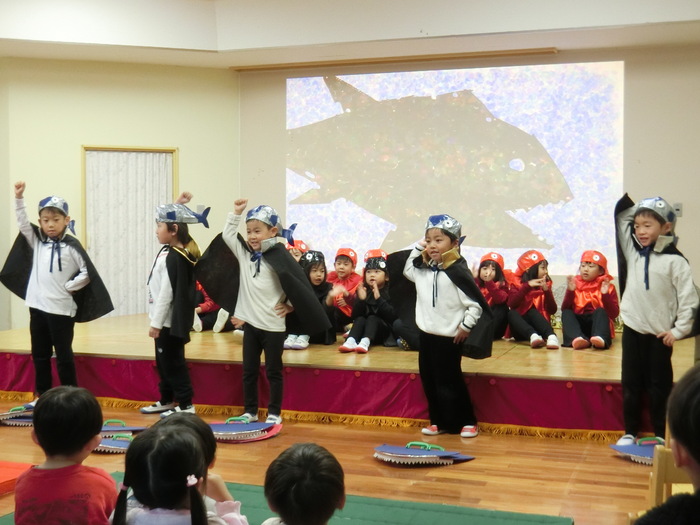 12月13日 生活発表会がありました。 トップバッターはひよこ組。 『きんぎょがにげた』 11人のかわいい金魚ちゃん♡ 初めての大舞台でしたが、みんないつも通りとっても楽しそうでした。 | ||