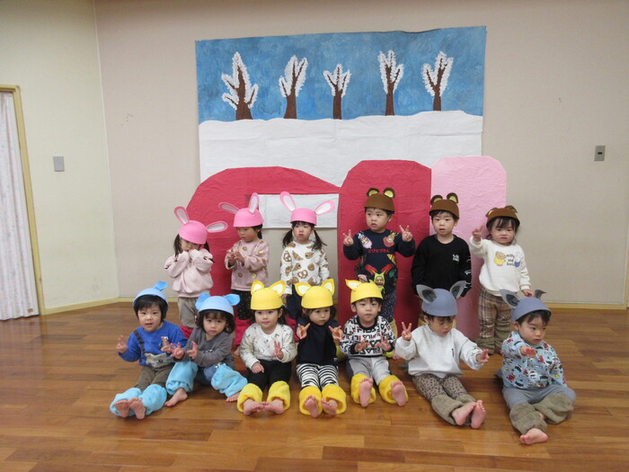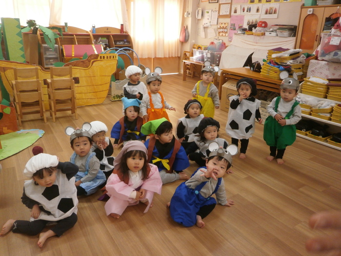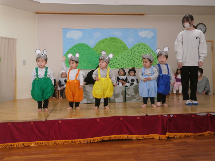 本番前のワンショット📸 「ねずみ・おじいさん・おばあさん・おむすび」 それぞれの役になっていろいろな動きを楽しみました。 本番ではちょっぴり緊張気味でしたが、みんな頑張りました!! | ||