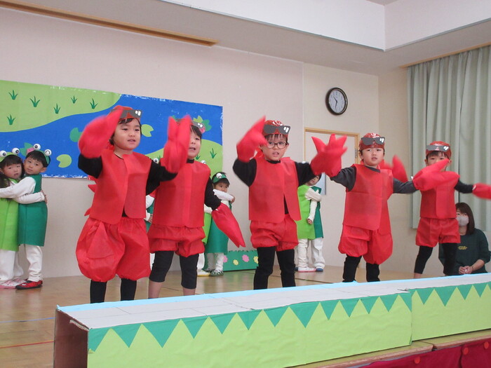 ♪もしもしかめよ~かめさんよ~ なつかしい歌もすっかり気に入って、楽しく練習していた子どもたち。 演技上手なあひる組さんでした😊 | ||