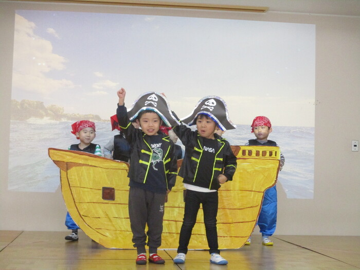海賊たちの宝さがしの旅のお話です。 劇中の『ヨーホー!!』のかけ声がお話を盛り上げてくれました😆 海賊が手に入れた宝物は 『ともだち』 心あたたまるきりん組さんの発表でした🩷 | ||