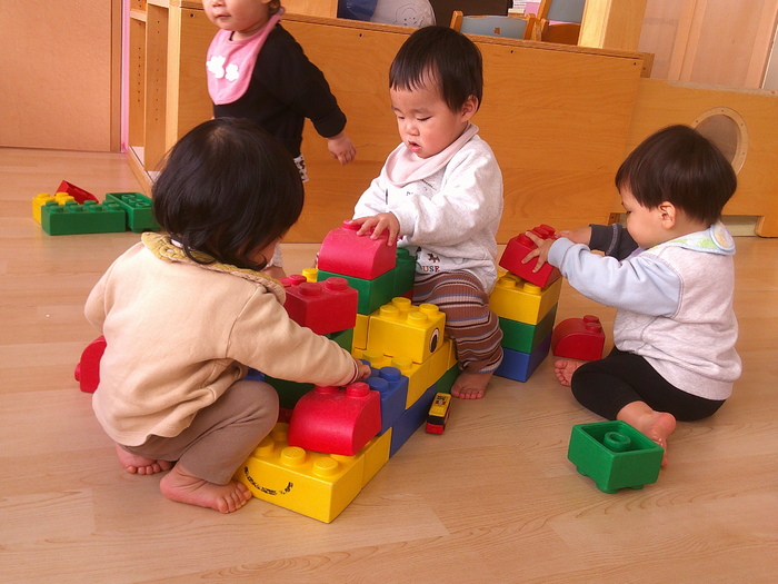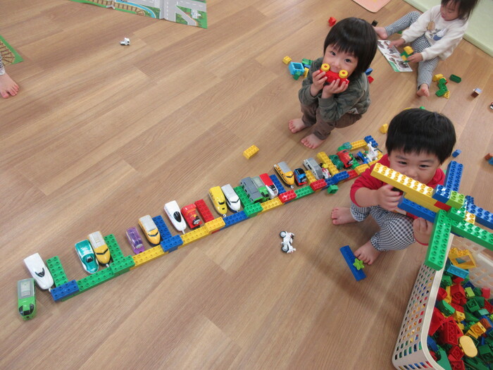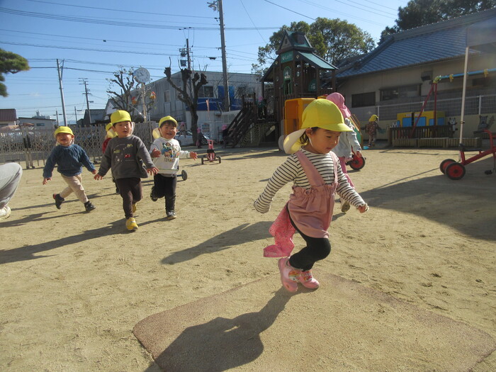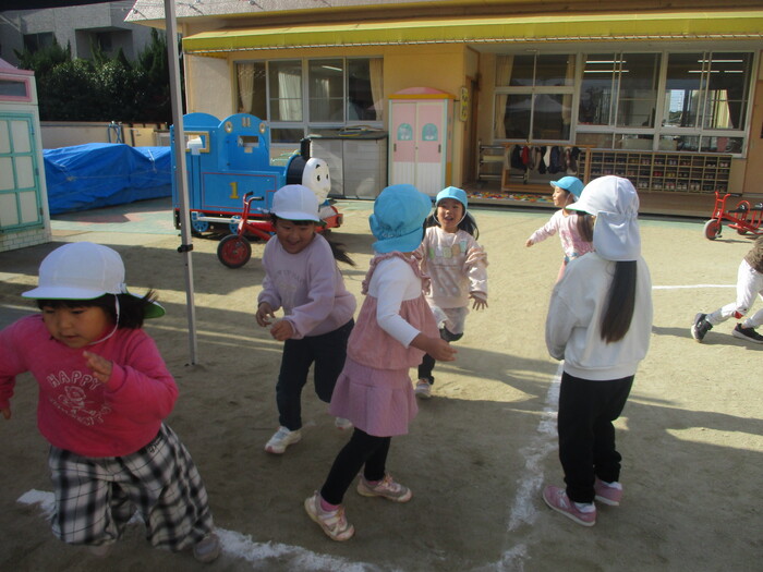 2階テラス入口のところはちょっぴり斜面になっていて、走り出したくなっちゃいます(笑) みんなで『よういドン‼』 しっぽとり鬼ごっこ、リレー。 みんな元気いっぱいです‼ | ||