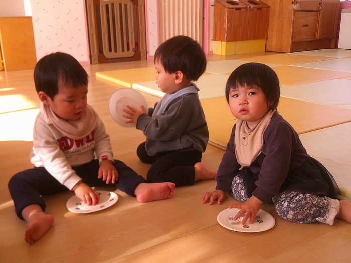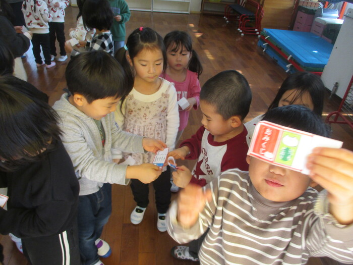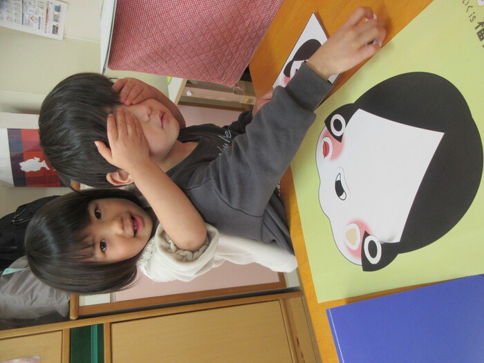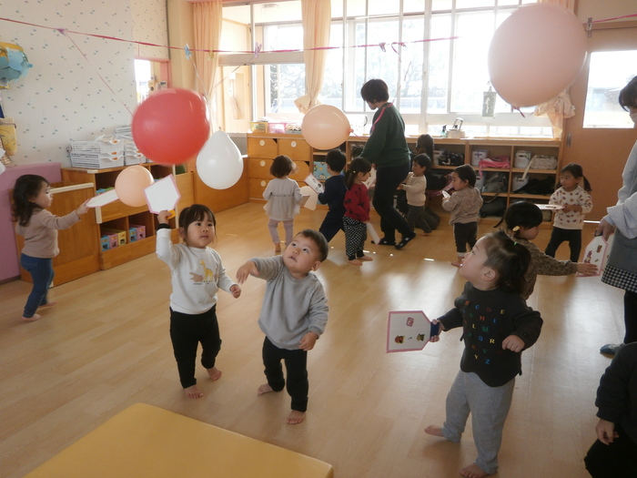 お誕生会では、こま回し、福笑い、羽根つき、凧あげとお正月の遊びを楽しみました。 羽根つきは難易度が高いので、風船で・・・😉 | ||