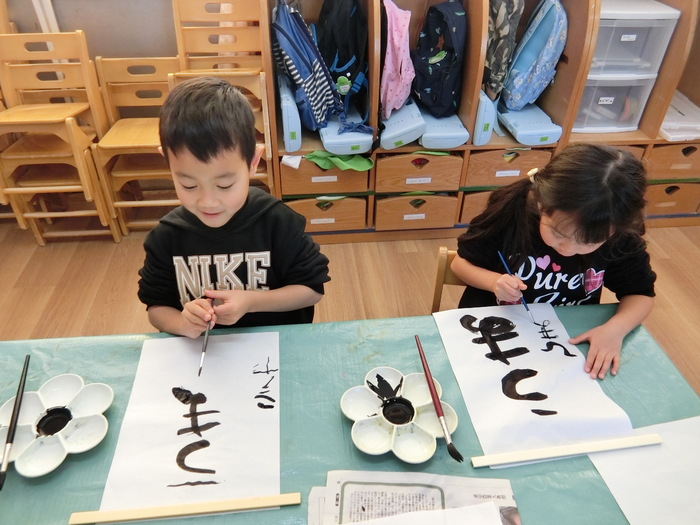 おみくじを引いたり、お参りをしたりと、さらにお正月気分を味わいました。 ぞう組さんは書き初めにもチャレンジ‼ | ||
