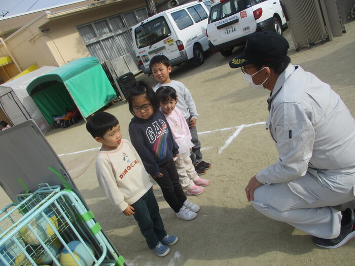 『交通安全教室』 いろいろな交通ルールのお勉強をしました。 園庭では、道路の歩き方の練習です。 『命はひとつ』 とっても大切なことを教えてもらいました。 | ||