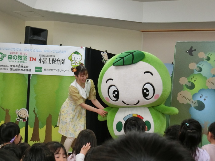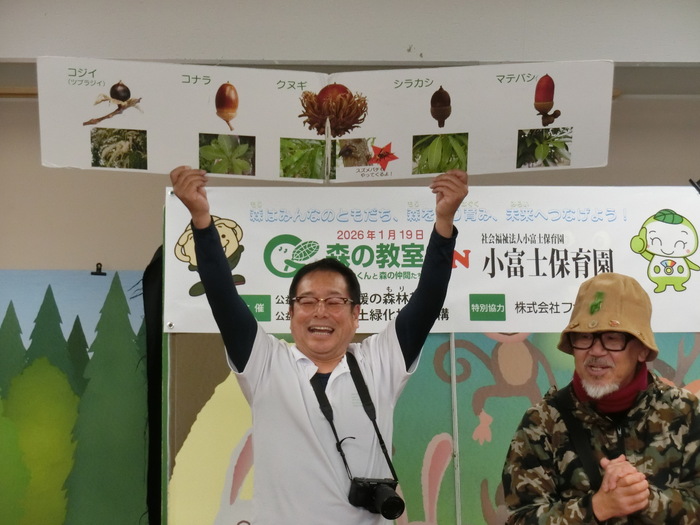 全国植樹祭の関連イベント『森の教室』に参加しました。 東京からキャラバン隊がやってきて、ショーを見たり、ダンスを楽しんだり🎵 森やどんぐりについてのお勉強もしました。 | ||