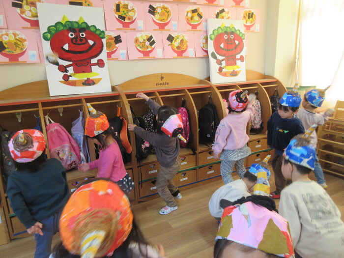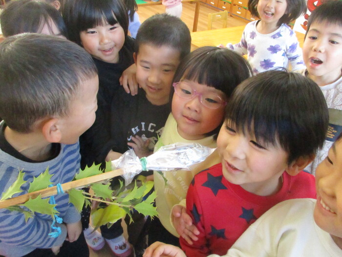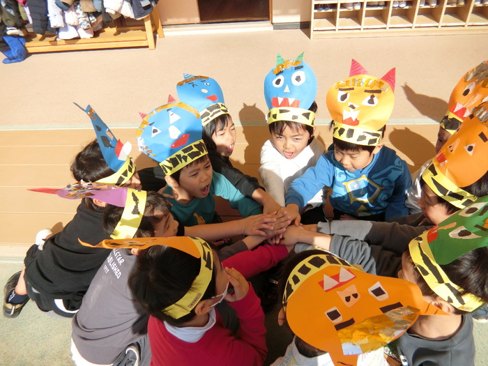 2月3日の節分👹 「オニくるー?」と朝から不安そうな子もチラホラ。 集会には、みんな自分で作ったお面をかぶって参加しました。 おにぐいの匂いを嗅いで、鬼をやっつけるための準備体操や予行演習もして… いざ‼‼ | ||