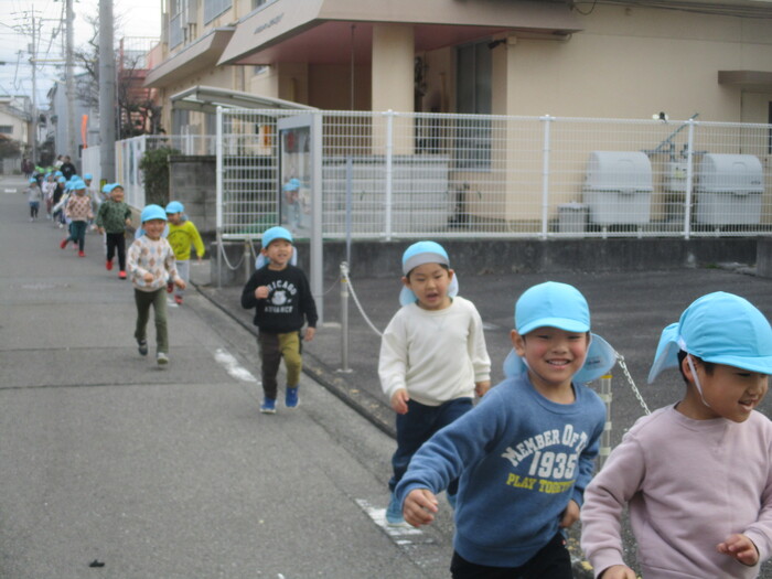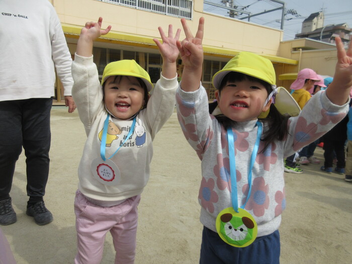 お誕生会で マラソン大会をしました。 きりん・ぞうぐみさんは、園の外に出て走りました。 「まだまだ走れるよー‼」とたくましい子どもたち。 毎日のマラソン効果で体力もつきました😄 がんばったごほうびにもらったメダル🏅 お迎えの時に、お家の人に自慢していました☺️ | ||