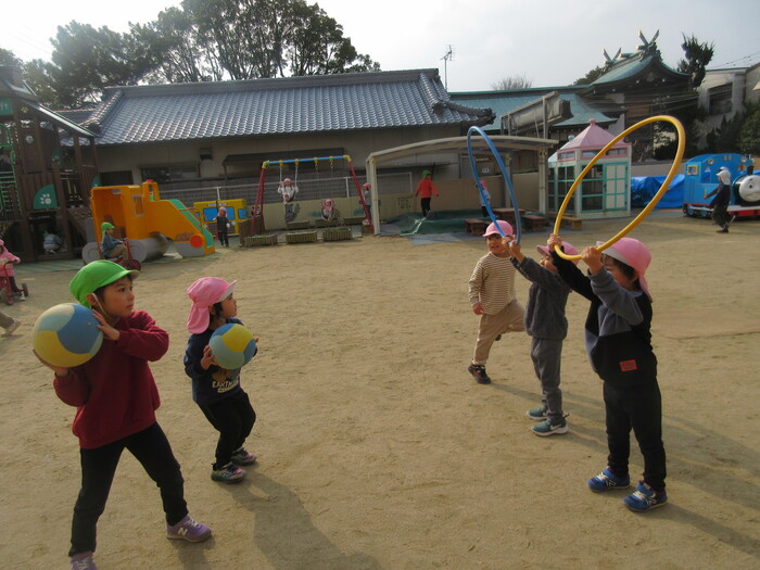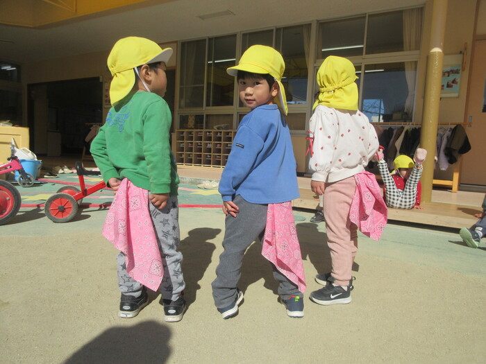 寒さに負けず元気いっぱい外遊び😄 スタンバイオッケー🙆 おしりにつけたバンダナはしっぽとり鬼ごっこのアイテムです! 自分たちで考えたボール遊び。 上手く通るかな~🤨 | ||