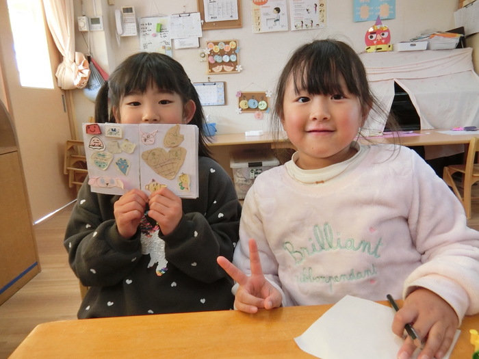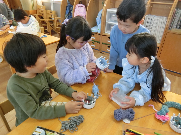 ぞうぐみさんのブーム 『シール帳』 これにはお約束があります。 それは、本物(シール)禁止! みんな自分で作った『手作りシール』を見せ合ったり、交換して楽しんでいます😊 もう一つは『あみあみくん』 コツをつかんでどんどん長く編めるようになっています。 | ||