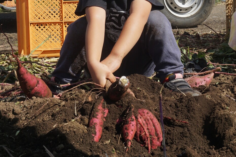 素手で土を掘り、五感で感じながら芋を見つけていきます。