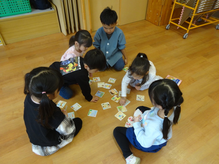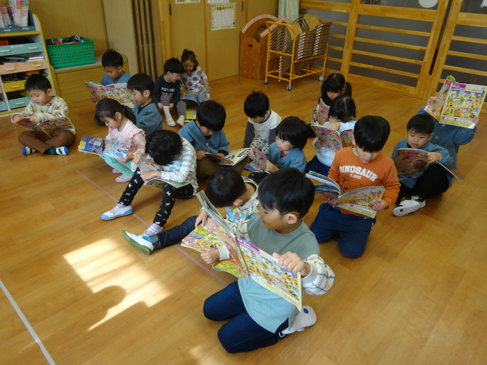 赤組(4歳児)さん カルタや絵本に夢中の赤組さん。 カルタでは、読む人と取る人に分かれて カルタを楽しんでいます♪ また、みんなで絵本を読めるようになりました! 園庭では、寒さに負けず リレーや鬼ごっこをして たくさん身体を動かして遊んでいます。 製作では、とってもかわいい サンタクロースのリースを作りました! | ||