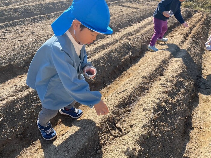 青組(3歳児)さん 自然に触れながら 元気いっぱい遊ぶ青組さん♡ 菜の花の種うえに行ってきました! 最初はパラパラ...と優しく蒔いていましたが 慣れてくると豪快な蒔きっぷりで 「たのしかったね~!」と大満足♪ 春に咲くのが楽しみです! 遊びのレベルもどんどん上がっていて 成長を感じます☆ | ||