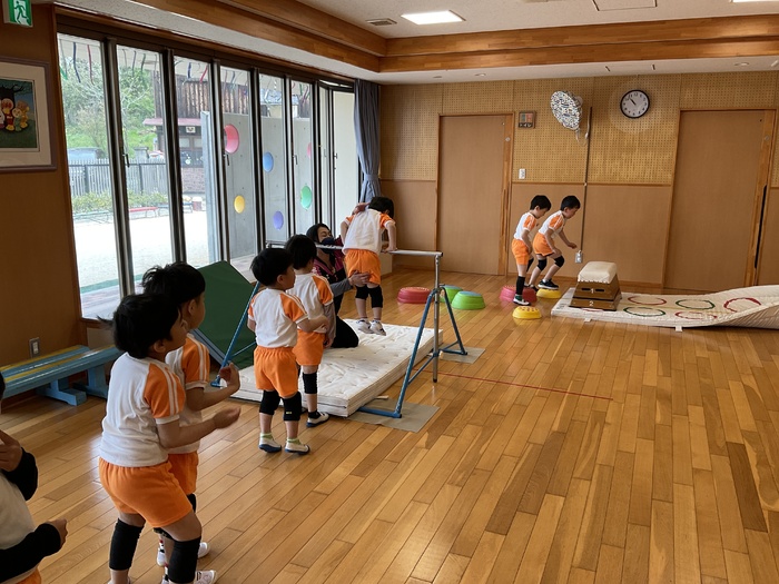 青組(3歳児)さん 青組さんになり1ヶ月が経ちました。 元気に部屋に入ってきて 荷物の片付けもがんばっています!! みんなとたくさん遊んで 楽しい思い出を作っていきたいです! 園庭では大好きな砂場や キッチンハウスでお料理したり 遠足では夢中で貝殻拾いをして楽しみました。 初めての体育教室では鉄棒にぶら下がったり トンネルをくぐったりして 「楽しかったね~♪」と 終わった後も盛り上がっていました! | ||