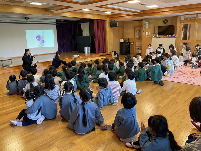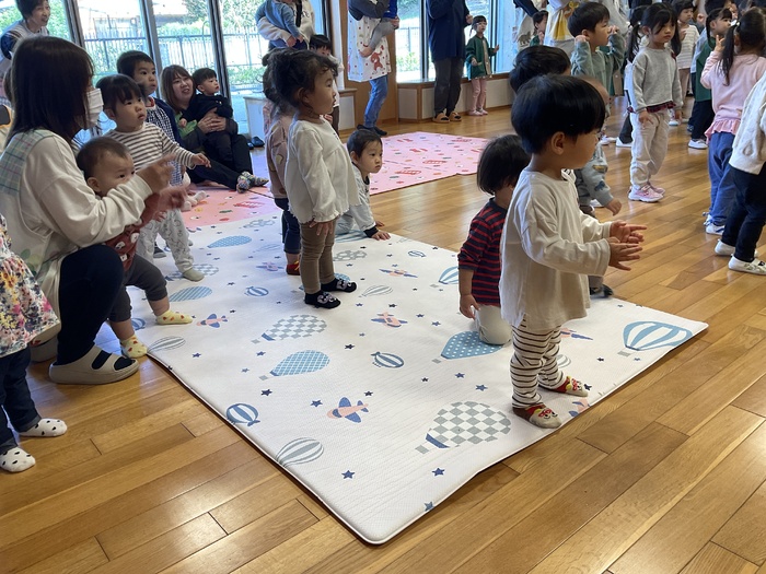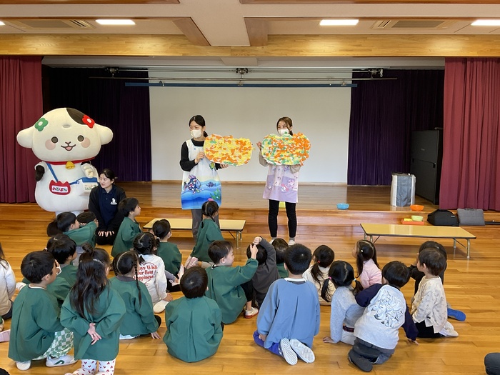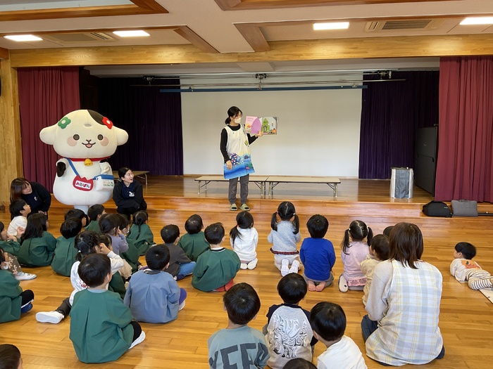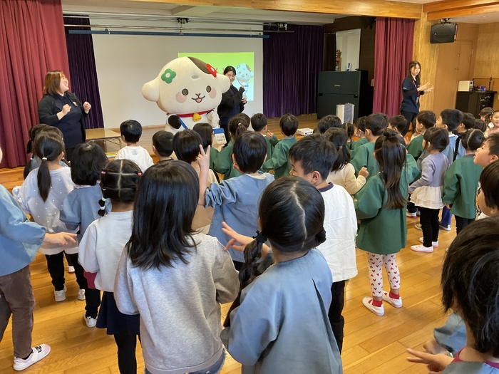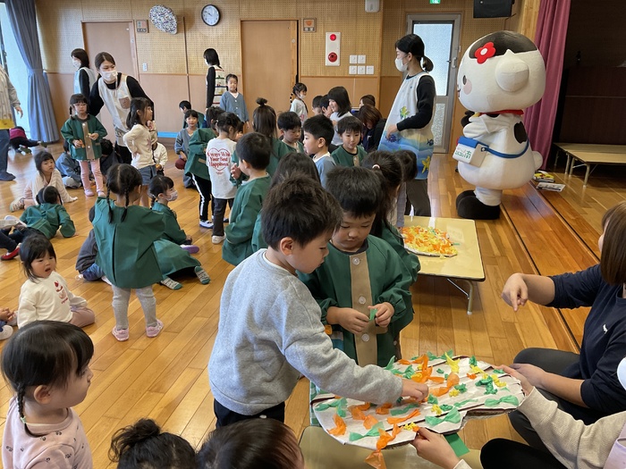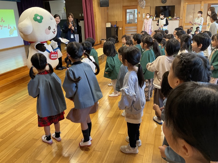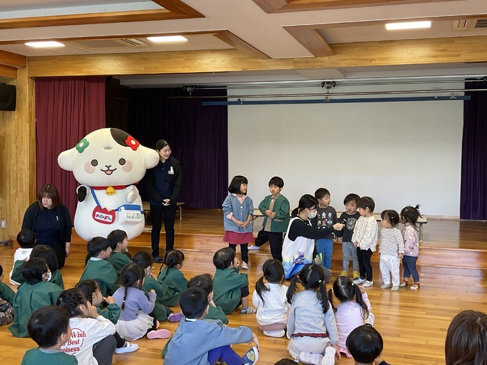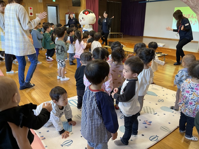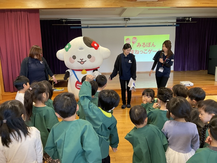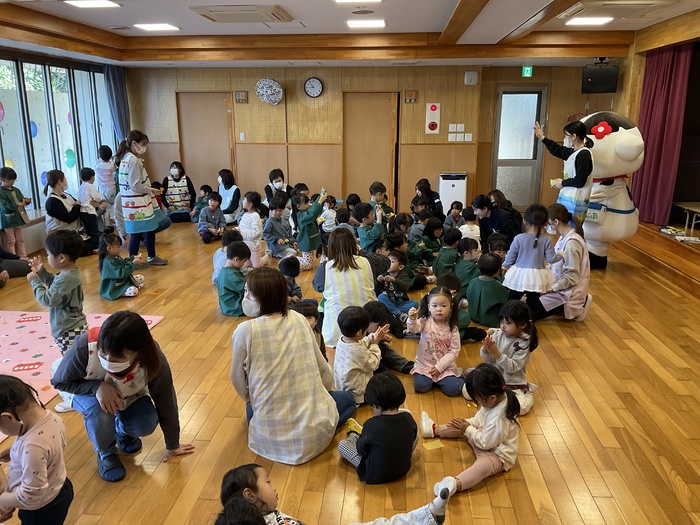 みるぽん食育イベント ミルコムのお姉さんと 牛のキャラクターのみるぽんが 乳製品の大切さを みんなに教えにきてくれました! 乳製品と牛さんに関するクイズや みるぽんと一緒にエビカニクスを踊って楽しみました! こどもたちに大人気のみるぽんでした♪ | ||