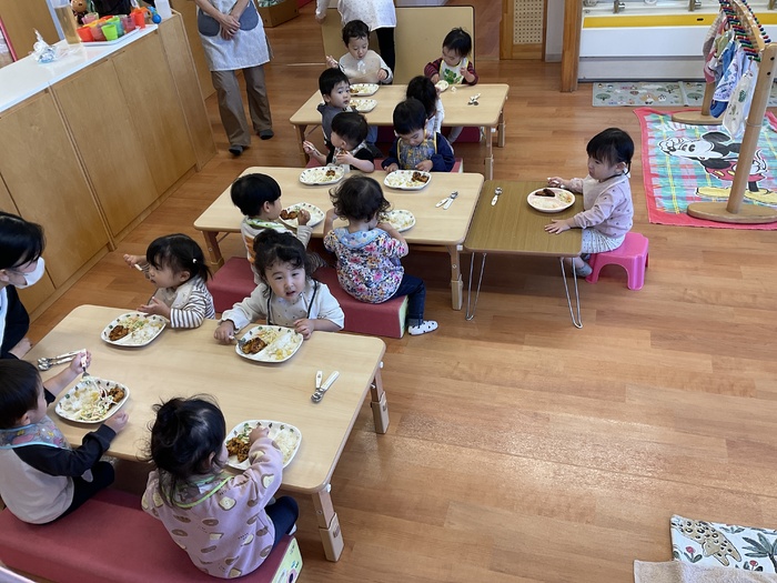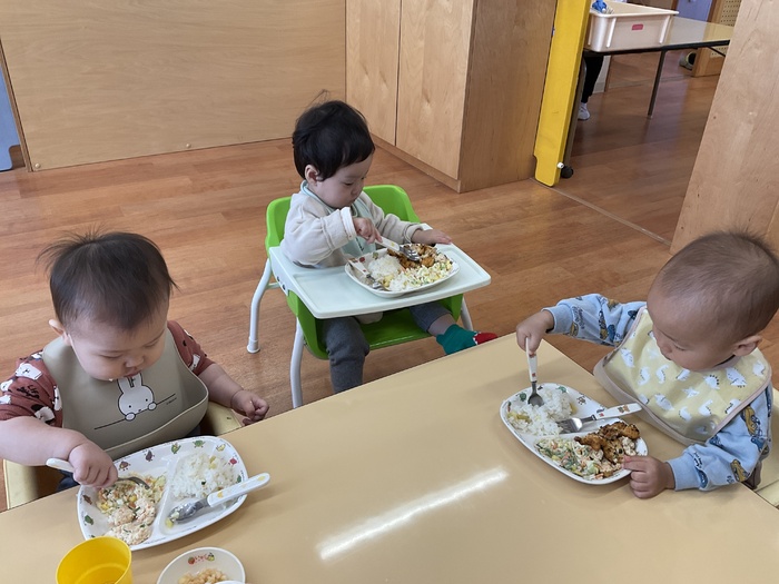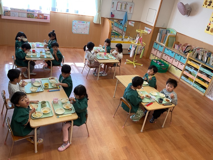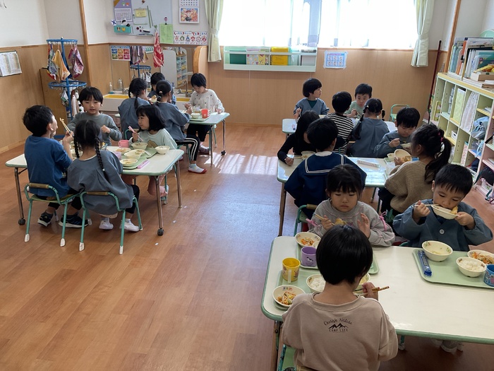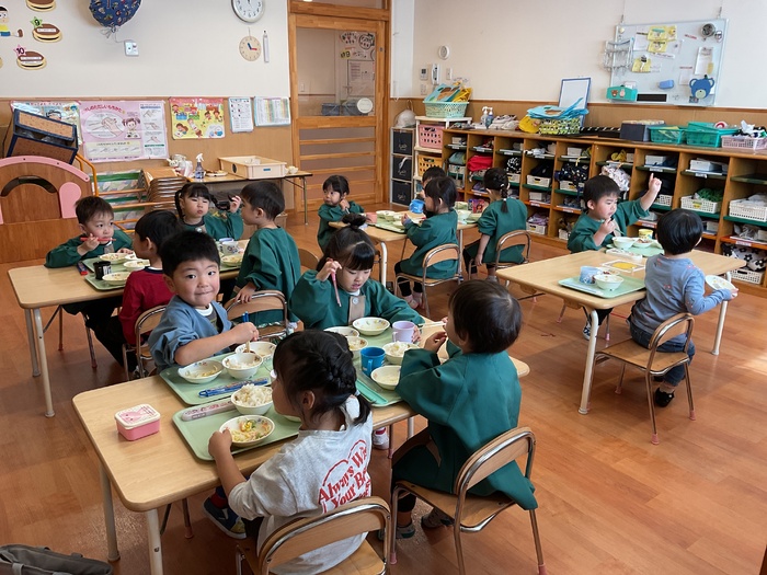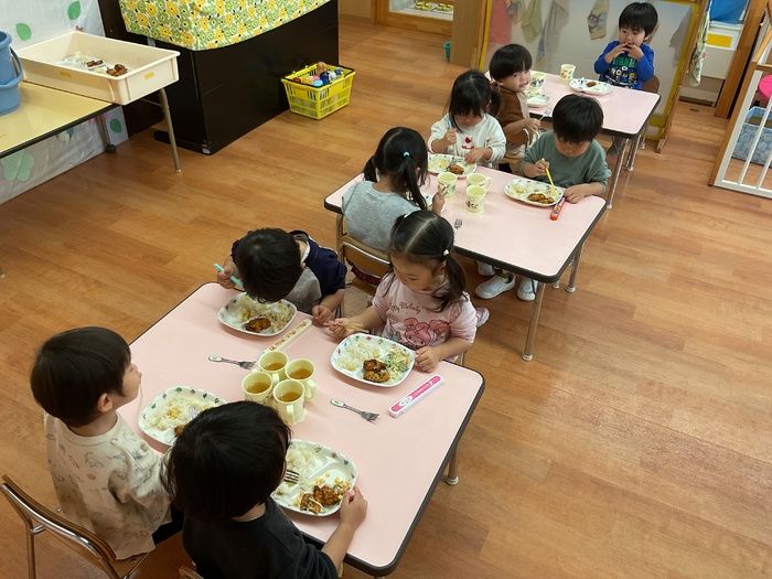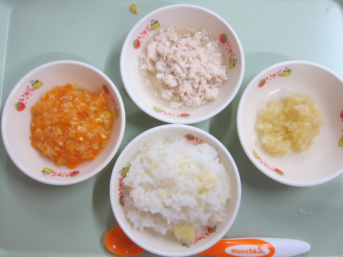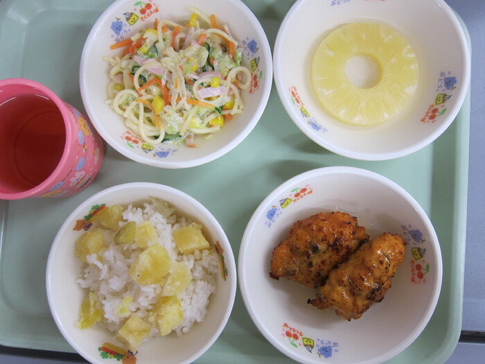 給食 《10月の誕生会メニュー》 さつまいもごはん 豆腐のまさご揚げ スパサラダ パイン缶 おいしかったね! ごちそうさまでした!! | ||