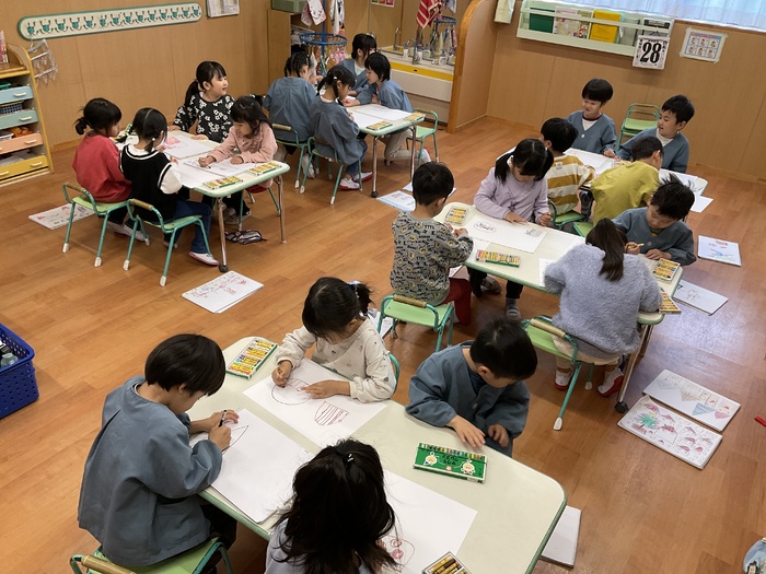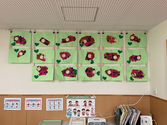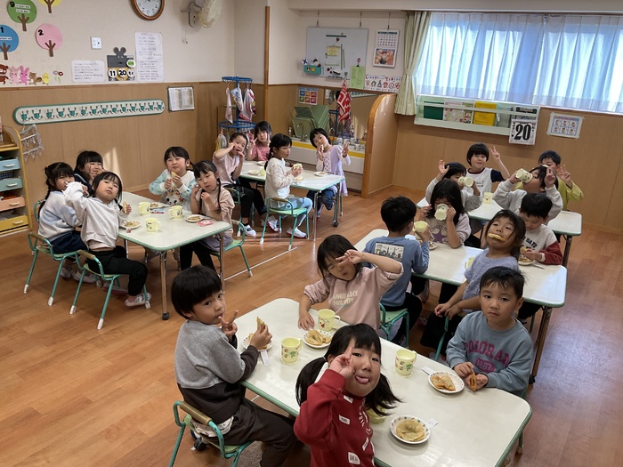 緑組(5歳児)さん 11月元気いっぱい遊びました。 鬼ごっこや虫探しに夢中です! 部屋では絵本読みをしたり 絵を描いたりしました。 クッキングでは「サモサ」を作り とっても上手に ぎょうざの皮で包むことができていました。 おいしかったね♡ | ||