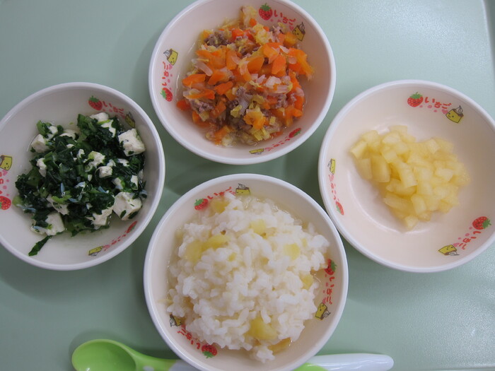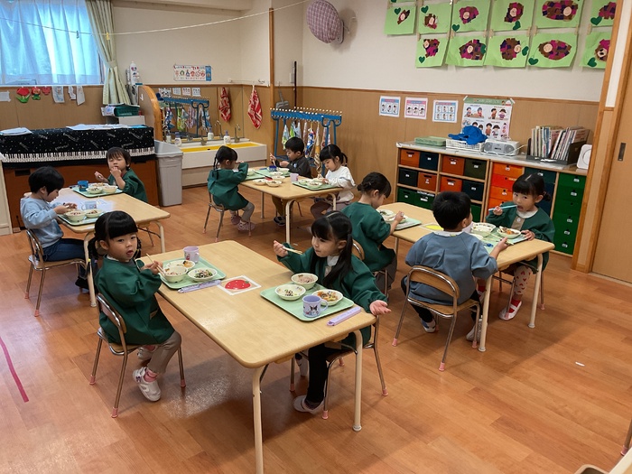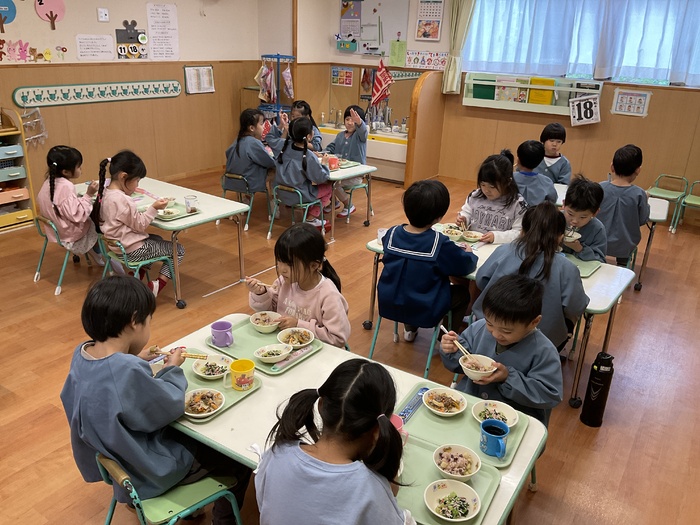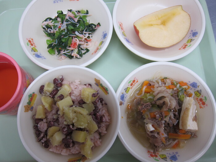 給食 《11月の誕生会メニュー》 さつまいもの金時ごはん すき焼き 小松菜の梅じゃこ和え りんご おいしかったね! ごちそうさまでした!! | ||