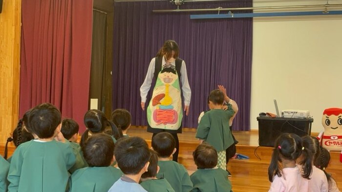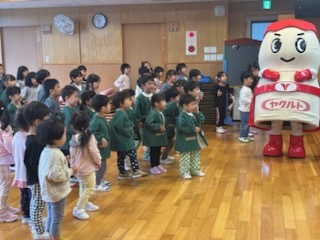 ヤクルト便強塾 ヤクルトのお姉さんが からだのしくみや栄養について 教えに来てくれました! 食事のことや便のことなど ヤクルトマンと一緒に 体操をして楽しみました♪ ヤクルトさんからヤクルトをいただき おやつと一緒に飲みました☺ | ||