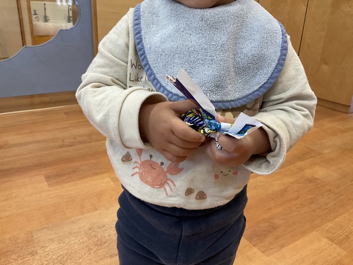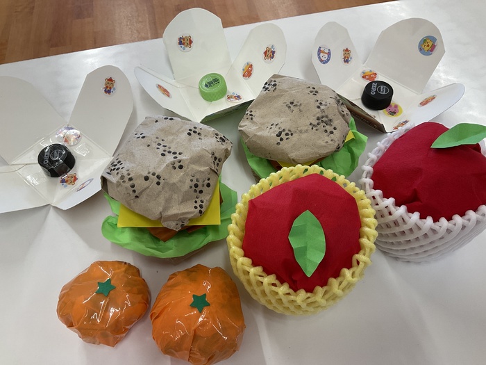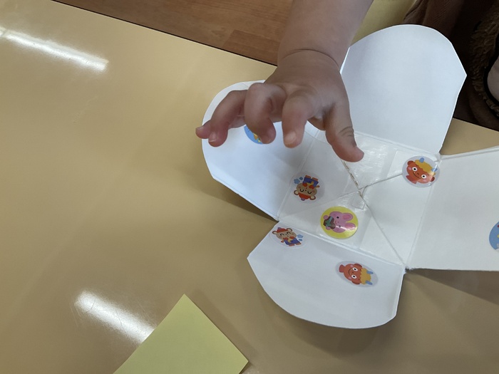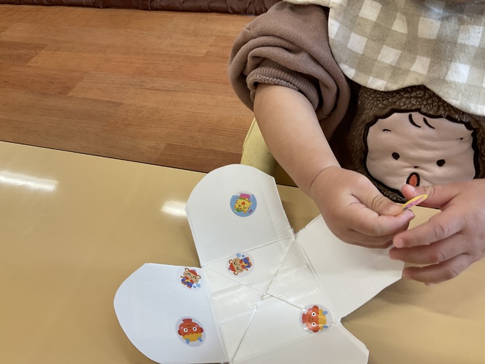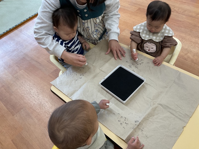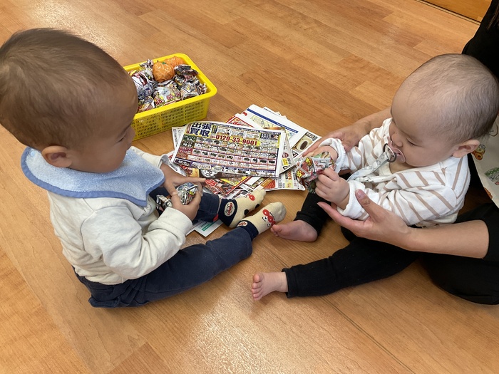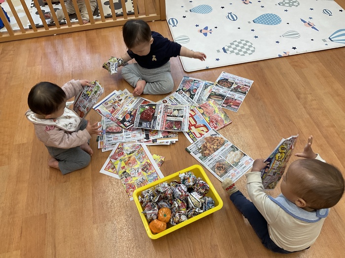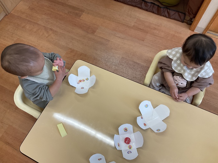 紫組(0歳児)さん 1月のお買い物ごっこに向けて制作をしています。 少しずつ、手指を上手に動かせるようになってきた紫組さん。左手から右手に持ち替えてみたり、つまんでみたり…。月齢が小さなお友達も保育士と一緒に製作をし、興味を持って参加しています!色々な素材の感触を楽しみながら作っていきたいと思います。 | ||