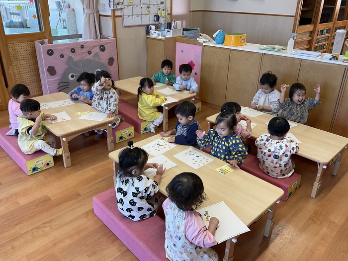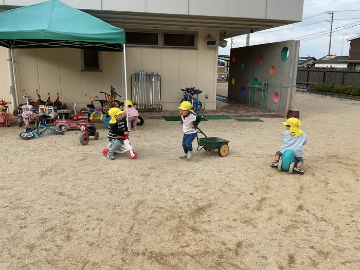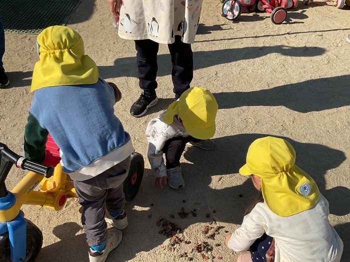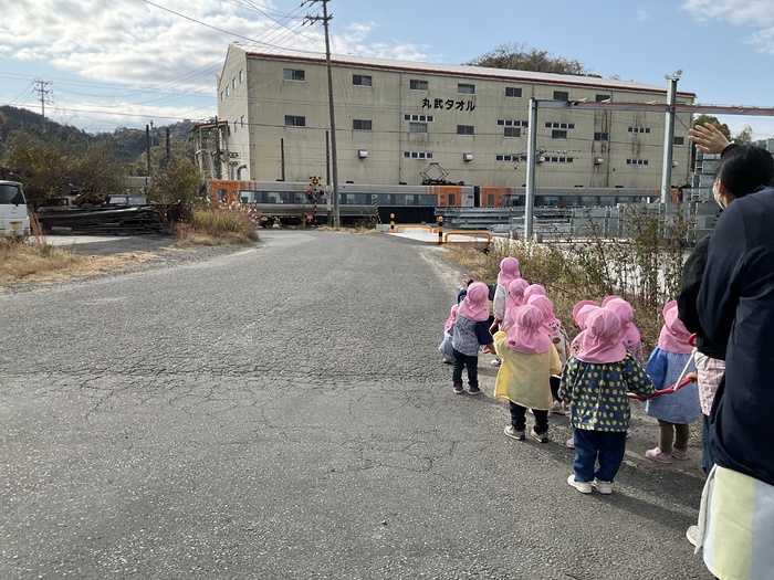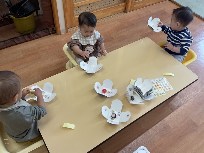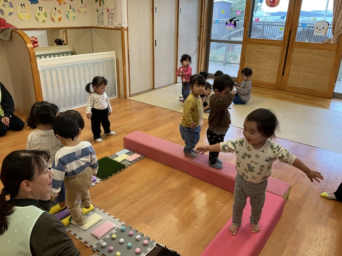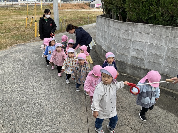 桃組(1歳児)さん 寒くなりましたが、元気いっぱいの桃組さん。 お散歩に行き、初の長距離に挑戦‼電車に手を振ったり、みかん畑でみかんを見つけたりと楽しそうに最後まで歩けました。指先が器用になり、紙遊びで破った紙を使ってピザにしたり、シール貼りも自分ではがして貼れたりするようになってきました。 また来年もいっぱい遊ぼうね♡ | ||