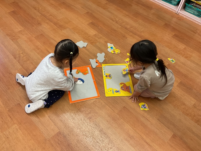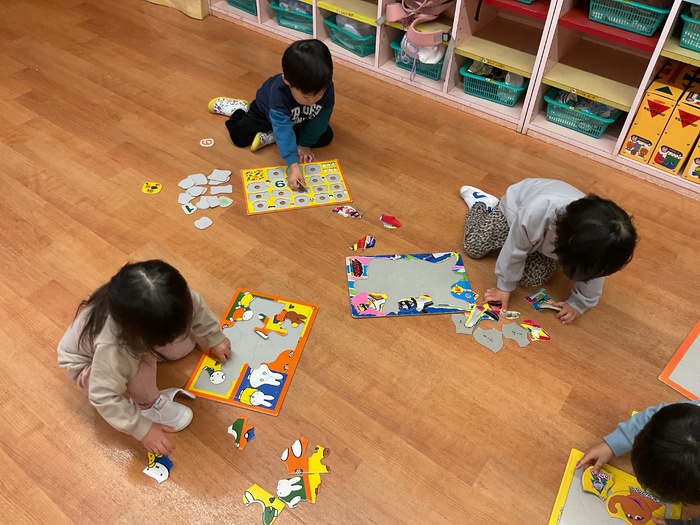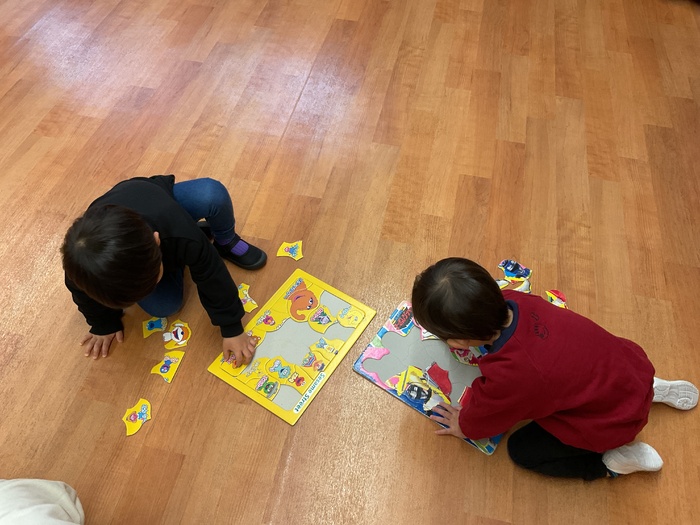 黄組(2歳児)さん 寒さに負けることなく、元気いっぱいの黄組さん‼園庭で遊ぶことを伝えると「いぇーい‼」「やったー‼」と大喜び♡園庭を走ったり、みんなでままごと遊びをしたりして楽しんでいます。 室内ではパズル遊びに挑戦!「ここ?」「こうかな?」と型に合うように集中してはめていってました。型が合うととっても嬉しそうでした♡ | ||