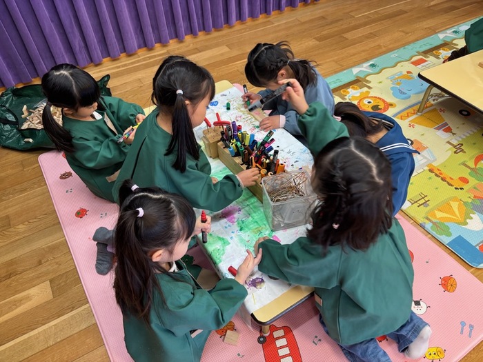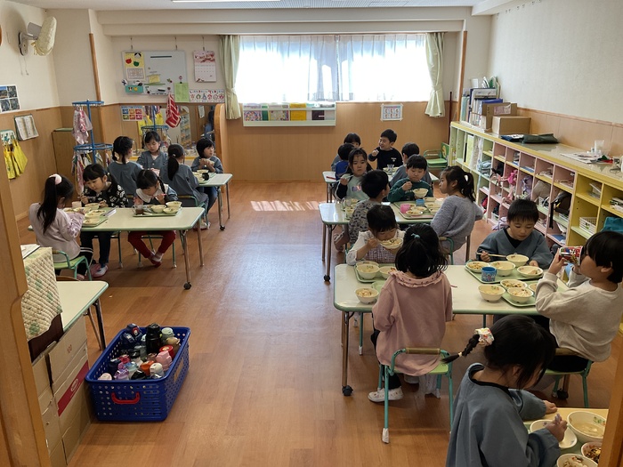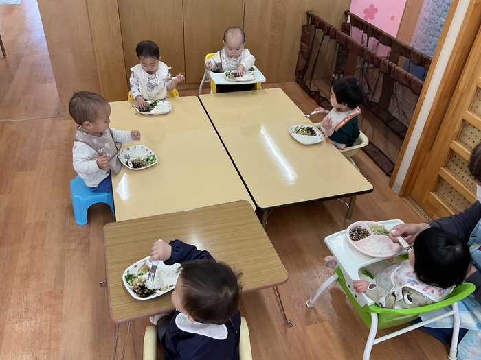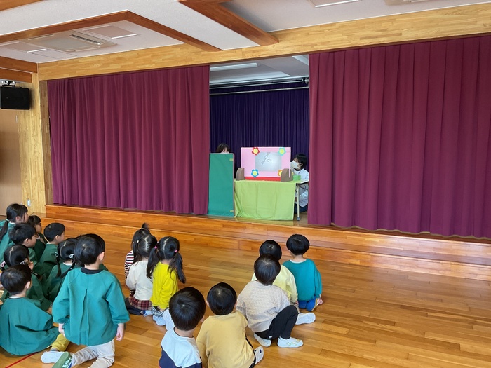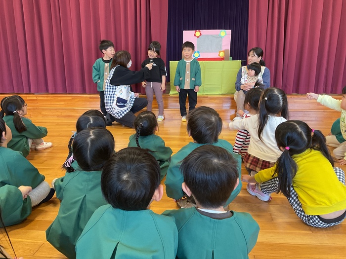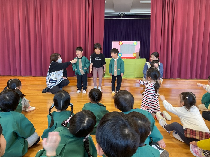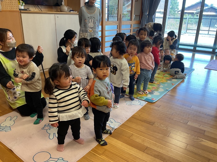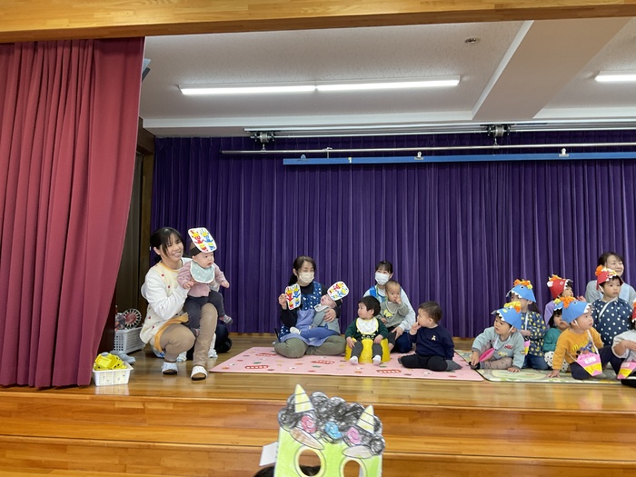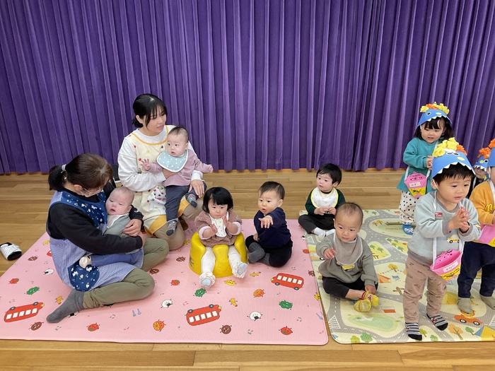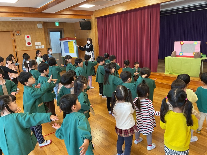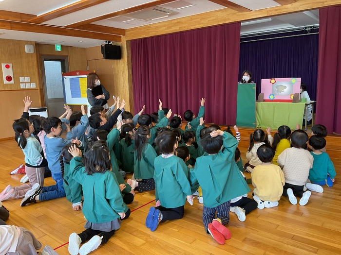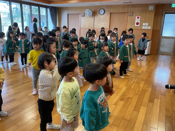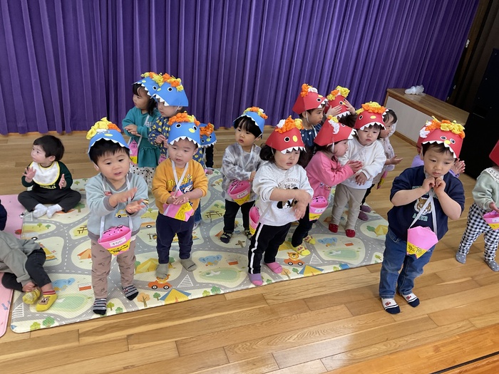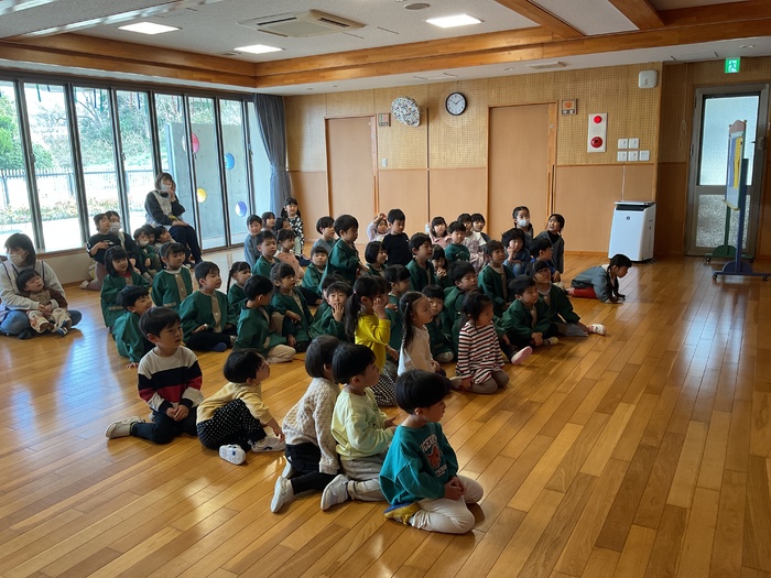なにかな?シルエットクイズでは影に映る不思議な形を見て「わかった!」「ぞう!」「ハサミ‼」など元気いっぱいで答え、正解すると「やった~‼」と大歓声。その後はおばけにんじゃのドロンドロンドロンをとってもノリノリで踊りました♪ 2月生まれのお友だちおたんじょうびおめでとう♡ | ||