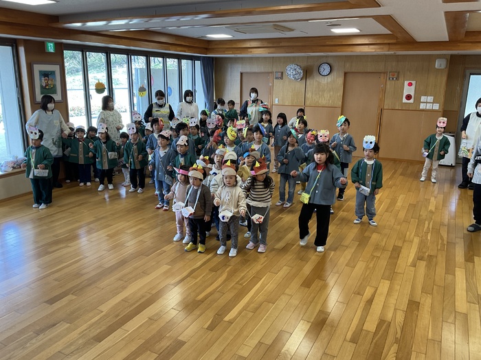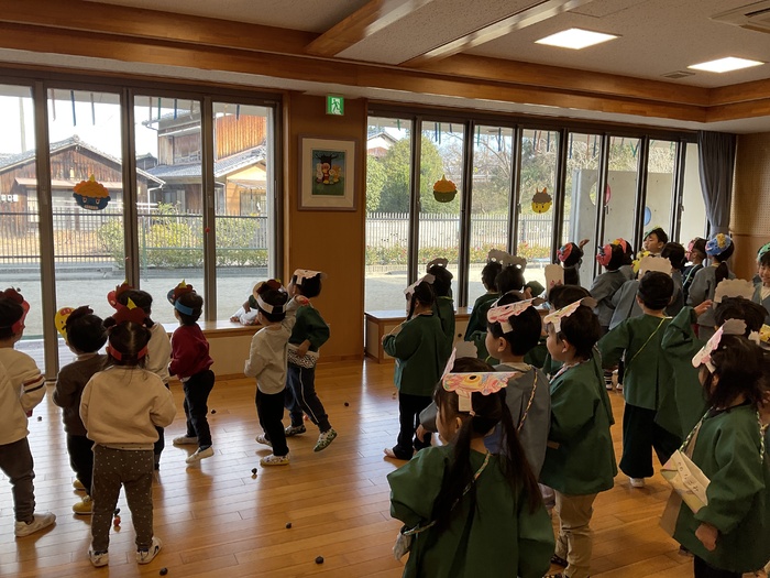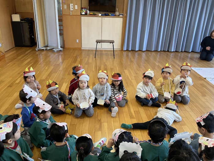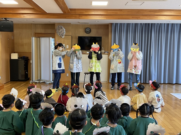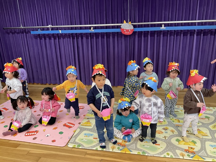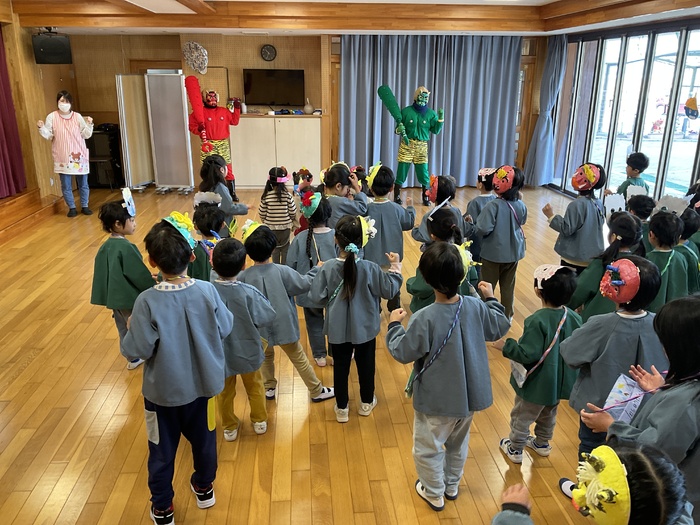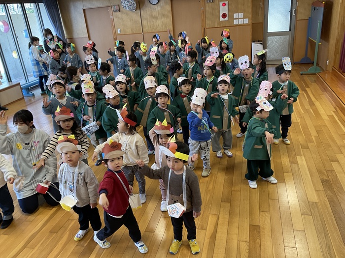 今日は豆まき集会でした。各クラスのお面を紹介し合い、節分についてのクイズをしました。お面に好きな色を塗ったり紙粘土で作ったり、楽しい作品がいっぱいでした。鬼にもいろんな鬼がいることも知りました。怒りんぼう鬼や好き嫌い鬼など、みんなの心の中の鬼を退治‼ 最後には、鬼さんと一緒に鬼のパンツを踊り、仲よくなることができました☺ | ||