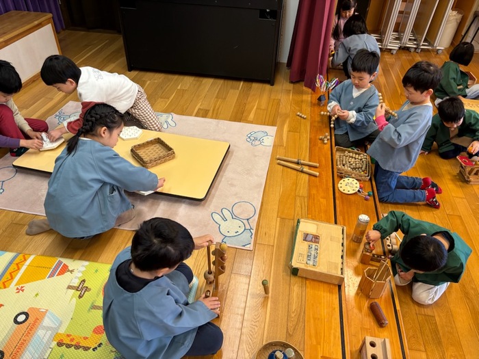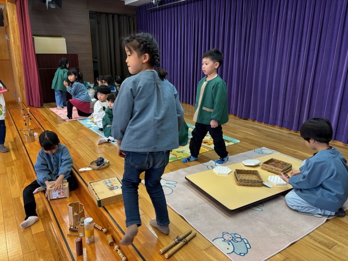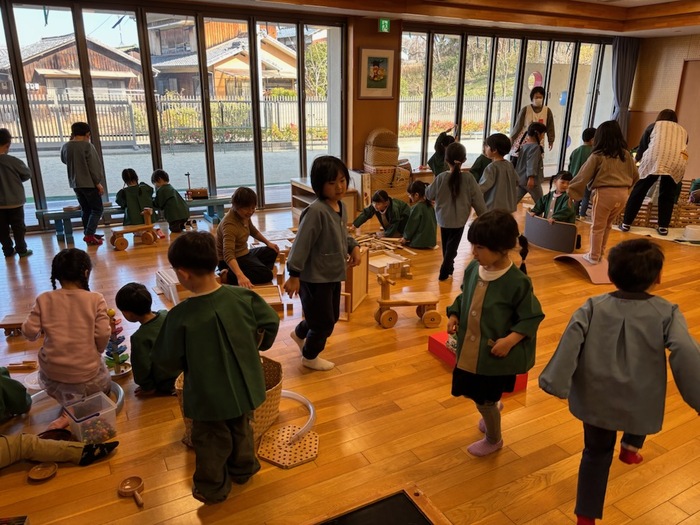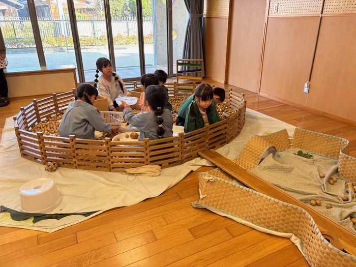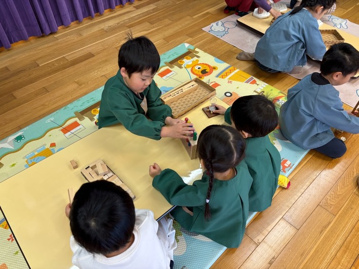 大五木材の″木のもの屋森羅″さんが木のおもちゃをたくさん持ってきてくれました。おゆうぎ室に入った瞬間、「わぁー‼」「楽しそう♪」と子どもたちの声が聞こえてきました。木のプールや積み木、車、工作やゲームなど目をキラキラ輝かせながら時間いっぱい遊びました。楽しかったね。 | ||