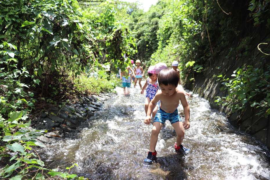 | ここ最近は暑い日が続き水遊びは欠かせない。園長が外で子どもと一緒に遊んでいるだけで汗がだらだらと流れ出てTシャツがびっしょりになってしまうほどだ。 そんな中、決して起こってはいけない事件が起きてしまった。福岡県の保育施設で送迎バスの中に園児を残したまま施錠してしまい、園児が死亡してしまったという事件である。原因としては送迎バスが到着して園児が下りた時に全員降りたのか確認をしなかったためであるという。通常バスの送迎を行っている園では考えられないような出来事である。まず、①全員が下りたかどうか確認する。荷物の置忘れ等も確認する。②クラスでいない園児がいたら必ずバス添乗または、運転者に園児の確認をする。③その確認もとれずに園児がいないと思ったら保護者に出欠の確認をとる。④それらのことを園長に報告する。などの処置があればこの事故は防げたかもしれない。 改めてそんなことを園全体で確認しあった。 日々の出来事であるが毎日そのような確認を怠らずしていきたいと感じた事件である。 木の実幼稚園の園舎の裏側には山伏川という名前の川が流れている。毎日、暑い日なのでプール遊びもしているが今日は川遊びにしようということで子どもたちは水着に着替え、川遊び用の靴を履いて川で遊ぶことになった。でこぼこの石がある川の上流まであるいていき、体中、水でびっしょりになって遊んだ。 そのあとは園庭にあるブラックべりーの実をそれぞれがとって口にほうばる。たくさんなっているので取り放題だ。皆で採ってジャムにしてパンにつけて食べるなど楽しい活動がたくさんある。 子どもたちはそんな日常の中での遊びを通し、心も体も成長していく。自由な遊びを通して子どもたちは自分自身を認めてもらい、自己肯定感を高めていく。遊びの中で自分の行動が認められ、人への思いやりの気持ちも生まれてくる。それが相乗効果となりお互いに相手のことを思いやる気持ちを持つ子どもたちに成長していく。決して特別なことではない。そんな何気ない日常であるが、その中に幸せを見つけることができるのではないだろうか。 | ||
