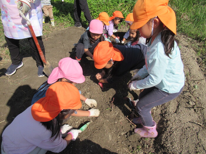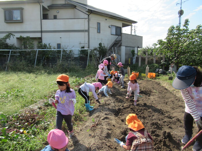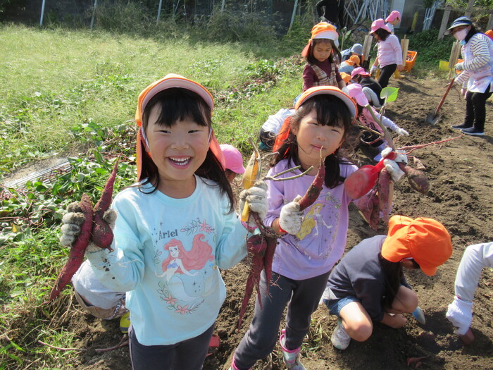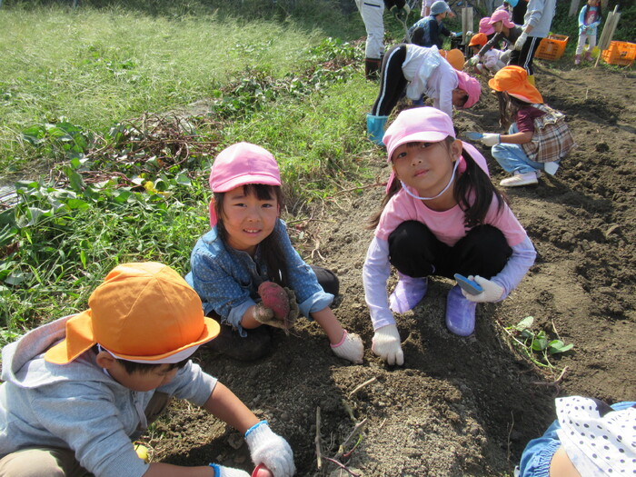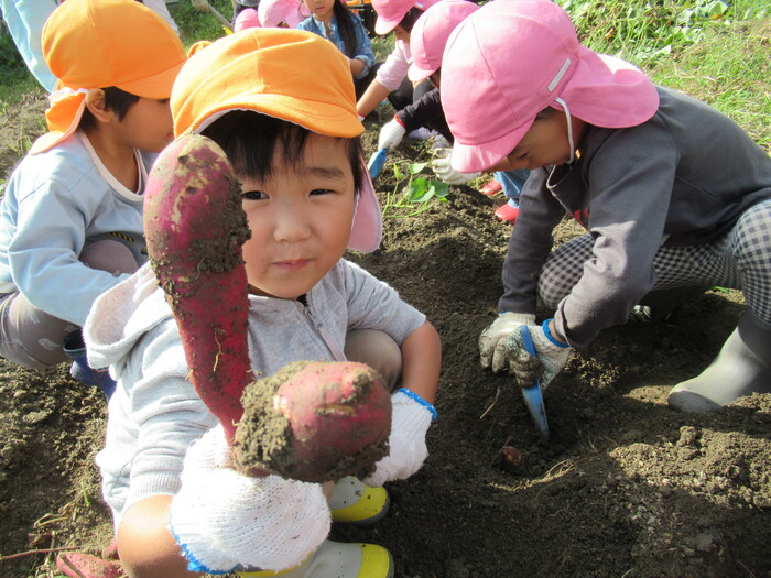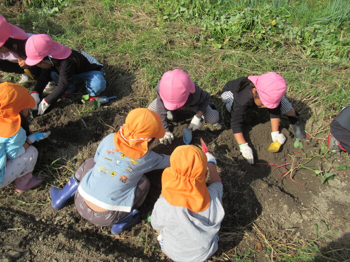 そら・にじ組が近所のまさおか農園へおいもほりに行き、三種類のお芋を順番に掘っていきました。 お芋が見えると近くにいる友だちを呼んで協力して掘る姿もたくさん見られました(*^-^*) 楽しいお芋ほりになりました♪毎年ご招待いただきありがとうございます! | ||